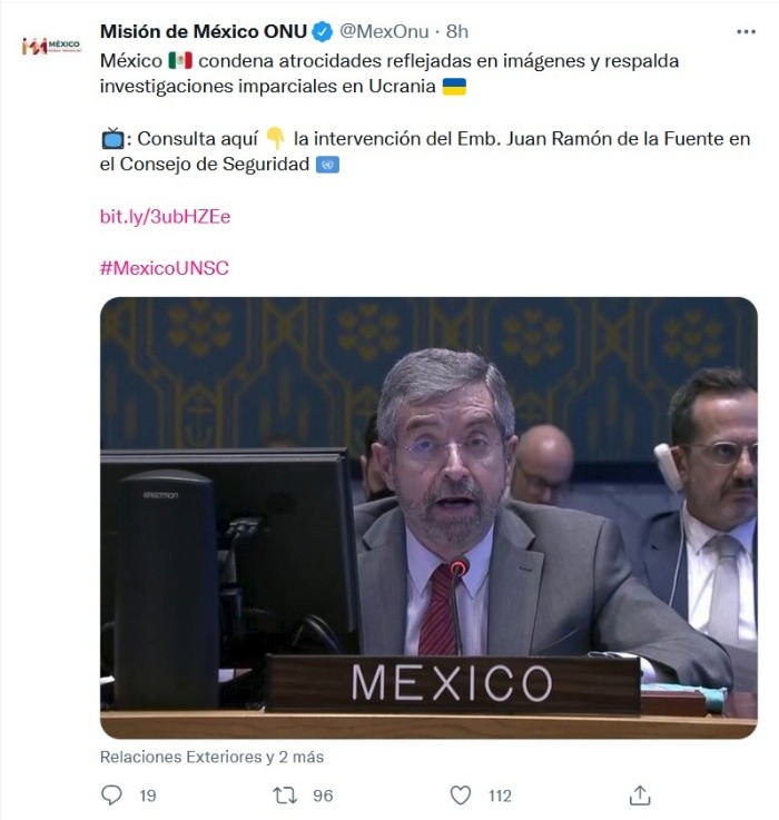 Juan Ramón de la Fuente, embajador de México ante Naciones Unidas (ONU), dijo este martes ante el Consejo de Seguridad que su país respalda la realización de una investigación que determine si en Ucrania se han cometido crímenes de guerra.Durante su intervención, De la Fuente señaló que "se escuchó al presidente Zelensky con respeto, y se vio con horror las imágenes mostradas sobre la guerra en Ucrania".Las últimas seis semanas, lamentó, "el mundo ha visto con desmayo las devastadoras consecuencias de la invasión de Rusia en Ucrania".Recordó que en dos resoluciones aprobadas por la Asamblea General de la ONU, "la comunidad internacional ha asumido una postura clara, fuerte, deplorando la invasión y exigiendo el inmediato cese de hostilidades, así como de cualquier ataque contra la población civil o infraestructura civil".En su momento, dijo, la Corte Internacional de Justicia también pidió el fin de las operaciones del ejército ruso en Ucrania. Ahora, subrayó, "toca a la ONU actuar como garante de decisiones de la CIJ. Todos los mecanismos para el arreglo pacífico de las disputas, que establece el derecho internacional deben canalizarse hacia ese objetivo común".Sobre las imágenes que han circulado en los últimos días, donde se muestran cadáveres de civiles en las calles de Bocha y los alrededores de Kiev, la capital ucraniana, crímenes de los que Ucrania acusa a las fuerzas rusas, De la Fuente dijo que "han conmocionado al mundo. Condenamos de manera enérgica las atrocidades que en ellas se reflejan; no hay absolutamente nada que las justifique. Proteger a la población civil es una responsabilidad irrenunciable de la comunidad internacional".Coincidió con las declaraciones de la Alta Comisionada de Derechos Humanos, Michelle Bachelet, sobre la posibilidad de que las graves violaciones al derecho internacional humanitario y al derecho internacional de los derechos humanos constituyan crímenes de guerra.También aludió al impacto "dramático" de la guerra que, dijo, "tendrá efecto en el mediano y largo plazo, no sólo en la región, sino en el resto del mundo. Millones de personas pagarán en carne propia el precio de este conflicto. Habrá escasez de alimentos básicos en muchas regiones de por sí inseguras y frágiles".Insistió en que más allá de los esfuerzos inmediatos de la comunidad internacional, la solución de fondo al conflicto en Ucrania es "un cese inmediato de las hostilidades y un acuerdo político que restaure las negociaciones por la vía diplomática".JM