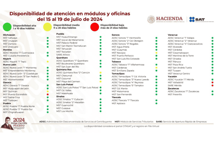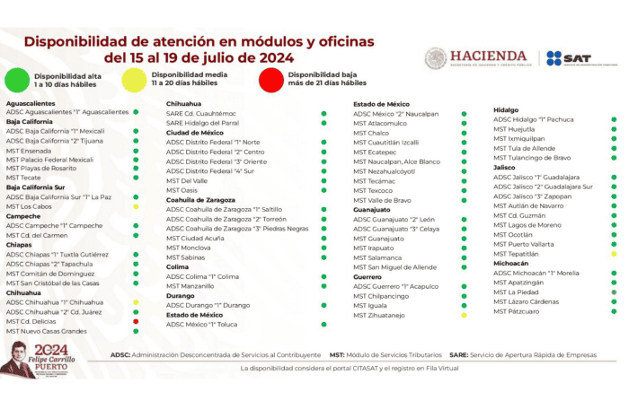 El Servicio de Administración Tributaria (SAT) ha difundido en su cuenta oficial de X el calendario con los horarios disponibles para recibir atención presencial en sus oficinas de todas las entidades federativas.El SAT también recalca que solo es necesario acudir en persona a las oficinas únicamente para registrarse en el Registro Federal de Contribuyentes (RFC) o para obtener la firma electrónica. Además, recuerda a los contribuyentes que las citas en las oficinas se gestionan a través del sistema de fila virtual.Si requieres acudir al SAT para realizar alguno de estos trámites, a continuación te mostramos la disponibilidad de citas en la semana del 15 al 19 de julio.De acuerdo con la información emitida a través de su perfil en X, SAT cuenta con la siguiente disponibilidad en las 32 entidades federativas:Disponibilidad alta 91%Disponibilidad media 6%Disponibilidad baja 3%También, el Servicio de Administración Tributaria informa que los adultos mayores, las personas con discapacidad, las mujeres embarazadas y aquellas con bebés lactantes pueden realizar sus trámites en las oficinas de hacienda sin necesidad de agendar una cita.Por último, se les recuerda a los ciudadanos que todos los trámites son gratuitos y que la mayoría pueden efectuarse en línea a través de www.sat.gob.mx. YC