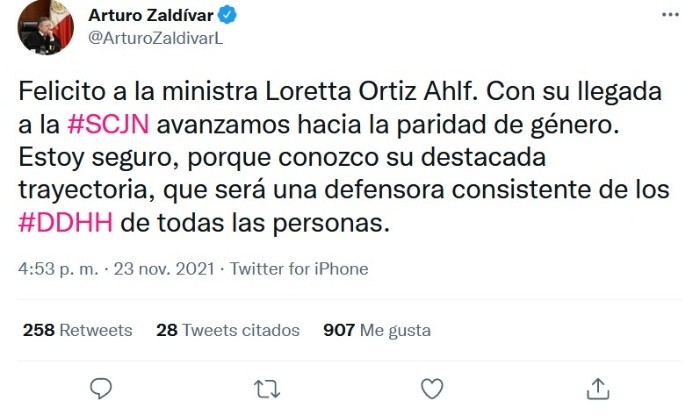 Con 92 votos a favor, el pleno del Senado de la República eligió a Loretta Ortiz Ahlf como nueva ministra de la Suprema Corte de Justicia de la Nación (SCJN), quien tomará posesión el próximo 12 de diciembre en sustitución de Fernando Franco González Salas, al concluir su periodo de 15 años como ministro.En una sola ronda de votación, Ortiz Ahlf logró la mayoría calificada de dos terceras partes de los senadores presentes en la sesión, que exige la Constitución, con lo que se convirtió en la última ministra que se integra a la SCJN durante el sexenio del Presidente Andrés Manuel López Obrador (AMLO).De esta manera, el pleno de la Suprema Corte se integra ahora por siete varones y cuatro mujeres.Del resto de la terna propuesta, Verónica de Gyvés obtuvo nueve votos, mientras que el tercer aspirante, Bernardo Bátiz, alcanzó ocho votos a favor.A través de redes sociales el ministro presidente de la Suprema Corte de Justicia de la Nación (SCJN), Arturo Zaldívar, felicitó a la nueva integrante del Máximo Tribunal, Loretta Ortiz Ahlf.Zaldívar indicó, en un mensaje posteado en su cuenta de Twitter, que con la llegada de la ahora exconsejera de la Judicatura Federal a la Corte la institución avanza a la paridad de género."Felicito a la ministra Loretta Ortiz Ahlf. Con su llegada a la #SCJN avanzamos hacia la paridad de género. Estoy seguro, porque conozco su destacada trayectoria, que será una defensora consistente de los #DDHH de todas las personas", publicó el ministro presidente.JM