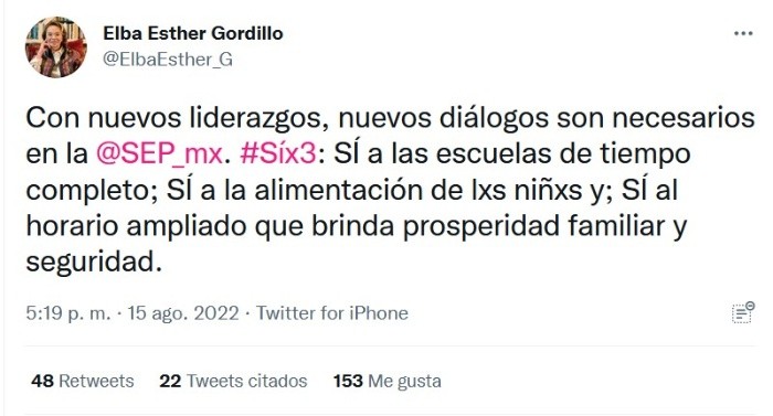 La exlideresa del Sindicato Nacional de los Trabajadores de la Educación, Elba Esther Gordillo, se pronunció a favor del diálogo con la nueva titular de la Secretaría de Educación Pública (SEP), Leticia Ramírez Amaya, y a la existencia de las escuelas de tiempo completo, a la alimentación de las niñas y de los niños en los planteles y al horario ampliado."Con nuevos liderazgos, nuevos diálogos son necesarios en la @SEP_mx. #Síx3: SÍ a las escuelas de tiempo completo; SÍ a la alimentación de lxs niñxs y; SÍ al horario ampliado que brinda prosperidad familiar y seguridad", escribió la política chiapaneca en su cuenta de Twitter.La mañana de este lunes, el Presidente Andrés Manuel López Obrador nombró a Leticia Ramírez Amaya como nueva secretaria de Educación Pública en sustitución de Delfina Gómez Álvarez."Lety tiene como profesión ser maestra, dio clases 12 años igual que la maestra Delfina; maestras de aula durante mucho tiempo"."Nos conocemos desde hace 28 años. Es una gente de absoluta confianza, preparada, honesta; igual que la maestra Delfina, con convicciones. Fue además dirigente en Sección IX del magisterio, tanto del SNTE como de la CNTE; entonces, es otra maestra la que va a estar a cargo de la SEP", dijo López Obrador en la mañanera de este lunes.JM