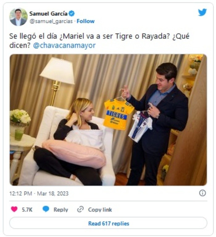 El gobernador de Nuevo León, Samuel García, presumió a su hija recién nacida con un outfit que ha sido tema de controversia entre él y su esposa, Mariana Rodríguez, desde antes que naciera la pequeña.Y es que Mariel, hija del gobernador y de la presidenta de Amar a Nuevo León, portó este sábado el uniforme del Club Tigres, equipo de futbol al que Samuel García le va, en contraste con el equipo de Mariana Rodríguez, quien es aficionada a los Rayados.Lo anterior en vísperas del Clásico regio de Tigres contra Monterrey, quienes jugaron su encuentro deportivo este sábado en el estadio Universitario, quedando con un marcador de 1-0 a favor de los Rayados.En redes sociales, el gobernador Samuel García publicó una foto de él y su esposa eligiendo el uniforme deportivo que portaría la nueva integrante de la familia.Posteriormente, el mandatario neoleonés publicó con una foto el outfit ganador para ese encuentro deportivo, dejando ver que la pequeña Mariel vistió el uniforme de Tigres UANL.La nueva pareja de papás ha mostrado en redes sociales que la pasión por sus equipos va más allá de sus gustos, pues ahora también hicieron partícipe del debate a su bebé.JM