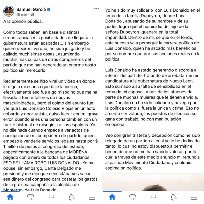 Luego de que presuntamente anunciara su renuncia al partido de Movimiento Ciudadano a través de un comunicado en Facebook durante la madrugada de este martes, el senador Samuel García aclaró que hackearon sus cuentas y que no se saldrá de las filas de este partido.En este post, el legislador también arremete contra Luis Donaldo Colosio y asegura que “en un acto cobarde y oportunista, quiso lucrar con mi grave error (sobre el video con su esposa Mariana Rodríguez) cuando él es una persona también con un fuerte historial de misoginia a sus espaldas”.Además, lo acusó de vender servicios legales hasta por un millón de pesos a la bancada de Morena en el Congreso del Estado, y de querer robarle su candidatura a la gubernatura de Nuevo León.La publicación rápidamente generó controversia, pues García señaló que supuestamente Dante Delgado lo presionó para que callara, pues “necesitábamos sacar ese dinero del Congreso para costear los gastos de la próxima campaña a la alcaldía de Monterrey, de Luis Donaldo”.Sin embargo, durante la mañana de hoy, Samuel publicó un video en su cuenta de Instagram donde confirmaba que esta publicación no fue realizada por él. Samuel García se ha visto en vuelto en muchos escándalos, el más reciente es por un live que realizaba con su esposa, la influencer Mariana Rodríguez, donde le decía que no enseñara su pierna.Este acto generó una infinidad de críticas hacía el político y su actitud machista, por lo que poco después, éste se disculpó y aseguró que fue una broma.GC