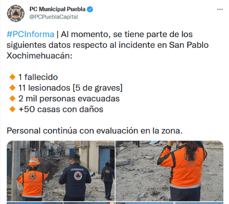 La madrugada de este domingo se registró una fuerte explosión en San Pablo Xochimehuacán, en el estado de Puebla, generada por una presunta toma clandestina en ductos de gas.Tras este incidente, que hasta el momento ha dejado 11 heridos, una persona muerta y daños en al menos 50 viviendas, usuarios en redes sociales han compartido videos sobre la explosión.Además, dos mil personas fueron evacuadas y Protección Civil de Puebla detalló que los ciudadanos que habiten a un kilómetro del radio de la explosión no podrán regresar a sus casas hasta nuevo aviso. En los clips que circulan por Twitter se puede observar la fuerte explosión que se registró, desde distintos ángulos, e incluso cómo se cimbran los vidrios de los lugares cercanos. En otros videos se aprecia a una multitud saliendo apresuradamente de sus casas para escapar del incendio que se generó tras la explosión de la toma clandestina. Elementos de la Policía Estatal, Bomberos, Protección Civil, así como personal de Pemex, atacaron el incendio, el cual fue controlado, pero no extinguido; se realizaron trabajos para cerrar el flujo de gas en el ducto y personal de la CFE realizaron cortes de energía eléctrica.Autoridades de los tres niveles de gobierno establecieron tres refugios en Puebla y uno más en el estado de Tlaxcala, éste último debido a la cercanía con la zona del accidente que dejó siete heridos la madrugada de hoy.El alcalde de la capital, Eduardo Rivera, quien acudió a la zona del accidente, reportó como controlada la situación e informó que evalúan afectaciones en la zona y coordinan acciones con autoridades estatales y federales.Llamó a la población a conservar la calma y no acercarse a la zona de los hechos, donde diversas instancias laboraban.Con información de SUNGC