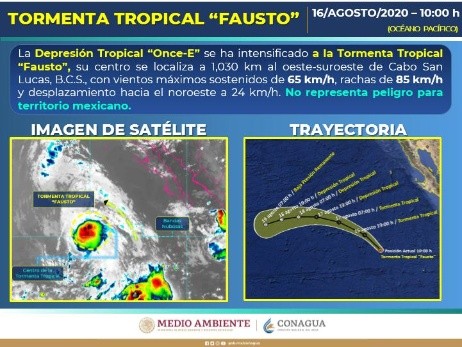 La depresión tropical Once-E se convirtió en la tormenta tropical "Fausto" en el Pacífico mexicano, reportó este domingo el Servicio Meteorológico Nacional (SMN) de la Comisión Nacional del Agua (Conagua).Aun así, su centro se localiza a mil 30 kilómetros al oeste-sureste de Cabo San Lucas, del estado de Baja California Sur, por lo que "no representa peligro para territorio mexicano", precisó el SMN.El fenómeno presenta vientos máximos sostenidos de 65 kilómetros por hora, con rachas de 85 kilómetros por hora y un desplazamiento hacia el noroeste a 24 kilómetros por hora.Por otro lado, la Conagua advirtió de la formación de la depresión tropical Doce-E, también en el Pacífico de México, donde podría convertirse en huracán categoría 1 este lunes.El fenómeno está casi 500 kilómetros al sur de Puerto de Ángel, Oaxaca, y 680 kilómetros al sur-sureste de Acapulco, Guerrero.Por ello, la dependencia pronosticó "lluvias puntuales intensas" en los estados de Guerrero, Oaxaca y Chiapas, además de lluvias "muy fuertes" en Veracruz, Puebla y Tabasco.También recomendó "extremar precauciones" al prever rachas de viento de entre 60 y 70 kilómetros por hora y un oleaje de dos a cuatro metros de altura en el litoral de Chiapas, Oaxaca y Guerrero.Al sumar a "Fausto", en el Pacífico se han presentado hasta el momento seis ciclones: las tormentas tropicales "Amanda", "Boris" y "Cristina", y los huracanas "Douglas" (con intensidad 3-5) y "Elida" (intensidad 1-2) en la escala Saffir Simpson.Ninguno ha causado grandes precipitaciones en México, aunque por el Atlántico, "Cristóbal" dejó inundaciones en el sureste del país y "Hanna" causó destrozos en los estados del noreste.Este año, México espera una temporada de ciclones tropicales más activa de lo normal, en la que se contempla la llegada de entre 30 y 37 eventos entre el Atlántico y el Pacífico.Las autoridades han pronosticado entre 15 y 18 ciclones para el Pacífico, de los que entre siete y ocho serán tormentas tropicales y de ocho a diez alcanzarán vientos de un huracán, con la mitad de ellos por encima de la categoría 2 de Saffir Simpson.La temporada de ciclones tropicales comienza cada año el 15 de mayo en el Pacífico y en el Atlántico el 1 de junio, con su final para ambas zonas el 30 de noviembre.GC