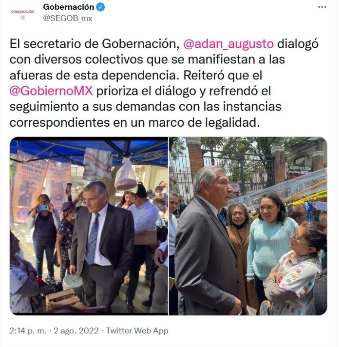 "¿Usted confía en mí?", cuestionó el secretario de Gobernación, Adán Augusto López, a la madre de un desaparecido en medio de un diálogo en las puertas de la dependencia."Pues la verdad yo no confío en nadie", respondió la mujer que forma parte de colectivos feministas y de familiares de desaparecidos.En el breve y por momentos atropellado, ríspido e inesperado diálogo, el funcionario, en tono algo molesto, reviró "pues yo tampoco confío en ustedes".Sin embargo, recompuso la respuesta y la matizó: "esto es de confianza".La mujer respondió: "Yo soy la madre de un desaparecido y por ello no confío en las autoridades, necesito un documento con firma y sello".Adán Augusto, agregó: "Yo le voy a firmar y sellar, lo que usted y yo quedemos".Los colectivos en el diálogo con el titular de Gobernación solicitaron una audiencia formal para analizar las denuncias que presentó la titular de la Comisión Nacional de los Derechos Humanos (CNDH), Rosario Piedra Ibarra, contra de ellas. "De eso no se preocupen", respondió el funcionario."Es respetable la protesta, hay que platicar con ellos... vamos a atenderlos a todos, yo no soy Ministerio Público o el fiscal, pero todo tiene un proceso y se va a resolver; son diferentes asuntos, pero se les va a encontrar solución. Esto no es un conflicto, pues es la tarea de Gobernación", agregó.Augusto López solicitó a las manifestantes retirar los bloqueos que existen en las inmediaciones de la Secretaría de Gobernación y reiteró que escuchará sus demandas y peticiones.JM