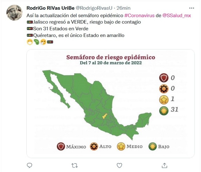 México tiene 31 estados en semáforo verde por COVID-19 y sólo uno en color amarillo, de acuerdo con la actualización de este indicador publicado este viernes por la Secretaría de Salud. Jalisco se une a las Entidades con riesgo bajo de contagio.El único estado del país en color amarillo es Querétaro. El nuevo semáforo de riesgo epidémico estará vigente del 7 al 20 de marzo, detalló la dependencia.El semáforo es un sistema de monitoreo para la regulación del uso del espacio público de acuerdo con el riesgo de contagio de COVID, indica la Secretaría.La actualización del semáforo ocurre en medio de una disminución de los contagios del virus en el país, de acuerdo con las cifras oficiales y el subsecretario de Salud, Hugo López-Gatell.Gatell señaló esta semana que México registra "una reducción muy sostenida de la pandemia".JM