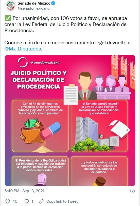 Tras varios días de negociaciones que permitieron modificar la minuta procedente de la Cámara de Diputados, el Senado de la República aprobó por unanimidad el proyecto de Decreto por el que se expide la Ley Federal de Juicio Político y Declaración de Procedencia.Tras arduas deliberaciones entre los coordinadores de los grupos parlamentarios, finalmente se determinó eliminar la facultad de la Cámara de Diputados para imponer su criterio en los casos de desafuero de los gobernadores, con lo que los congresos locales seguirán teniendo esa atribución.Al aceptar Morena y sus aliados este cambio en el dictamen, se destrabaron las pláticas, lo que hizo posible una votación unánime de 106 votos en favor de esta ley.La minuta con proyecto de decreto fue devuelta a San Lázaro, toda vez que es la cámara de origen, misma que tendrá que volver a discutirla y votarla.Esta reforma es reglamentaria de los artículos 108, 109, 110, 111 y 112 de la Constitución Política en materia de juicio político, declaración de procedencia y responsabilidad penal del Presidente de la República.La nueva ley actualiza, define y regula los procedimientos que permitan sancionar a servidores públicos, incluido el Presidente de la República, gobernadores y otros que violenten el buen funcionamiento de las instituciones públicas.Si te interesó esta noticia y quieres saber más, entonces descarga y descubre INFORMAPlus, la aplicación digital de EL INFORMADOR, en donde tenemos contenidos exclusivos, seleccionados por nuestros editores, para darles una experiencia más completa a los lectores. Si eres suscriptor de EL INFORMADOR tu acceso está incluido, solicítalo al 33 3678-7777.Descarga la aplicación y pruébala GRATIS por treinta días.Para iOS: https://apple.co/35jaVgbPara Android: https://bit.ly/3gwVSEVJM