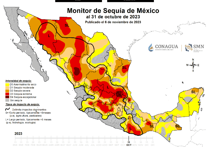 La escasez de agua es una realidad que requiere atención urgente. En México, desde hace años se han sufridos problemas por falta de este recurso natural, al menos casi el 60 por ciento del territorio nacional padece algún grado de sequía, de moderada a excepcional según datos del Monitor de Sequía en México (MSM) de la Comisión Nacional del Agua (Conagua).En el 2023 se reportaron altos niveles de sequía, con picos en enero, cuando se presentó en el 80 por ciento del territorio nacional, en marzo disminuyó al 52 por ciento, en agosto con 61 por ciento y en septiembre, con 75 por ciento. Esto significa que las 32 entidades federativas enfrentan algún grado de escasez de agua.De acuerdo con las Organización de las Naciones Unidas (ONU), las sequías se duplicarán para 2050. Esto, en palabras del IMCO, amenaza la disponibilidad y calidad del agua. Las sequías tienen múltiples causas interconectadas que incluyen el cambio climático, el crecimiento poblacional, la sobreexplotación del agua y la deforestación.De acuerdo con cifras del Grupo Intergubernamental de Expertos sobre el Cambio Climático (GIECC), en los últimos 50 años, en México, la temperatura ha aumentado un aproximado de 0.58 grados.De acuerdo con las dependencias, entre los estados más afectados por la falta de agua están los siguientes:Datos del Instituto Nacional de Estadística y Geografía (Inegi) muestran que en los últimos 120 años ha disminuido en 88 por ciento la disponibilidad de agua por habitante, ya que mientras en 1910 era de 31 mil metros cúbicos por persona al año, en 2019 bajó a 3 mil 586 metros cúbicos por cada mexicano.Mantente al día con las noticias, únete a nuestro canal de WhatsappMM