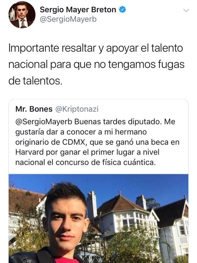 El actor y político Sergio Mayer se convirtió en una de las personalidades, que como Marcelo Ebrard, han sido objeto de críticas por caer en una broma de un usuario en las redes.El diputado federal compartió un tuit en donde lo citaban para apoyar a un supuesto estudiante que obtuvo una beca en Harvard por ganar el primer lugar en un concurso de física cuántica. En la publicación se puede ver la foto del joven, sin embargo la persona que sale en la imagen se trata del actor español de películas para adultos, Jordi ENP "El niño polla"."Sergio Mayer, buenas tardes diputado. Me gustaría dar a conocer a mi hermano originario de CDMX, que se ganó una beca en Harvard por ganar el primer lugar a nivel nacional el concurso de física cuántica", se lee en el tuit.Sin darse cuenta de la broma, Sergio Mayer retuiteó la imagen y escribió: "Importante resaltar y apoyar el talento nacional para que no tengamos fugas de talentos".Usuarios se percataron de la broma e identificaron al "Niño polla" y se mofaron del actor. Al darse cuenta, Meyer eliminó el tuit y aceptó su error.JB