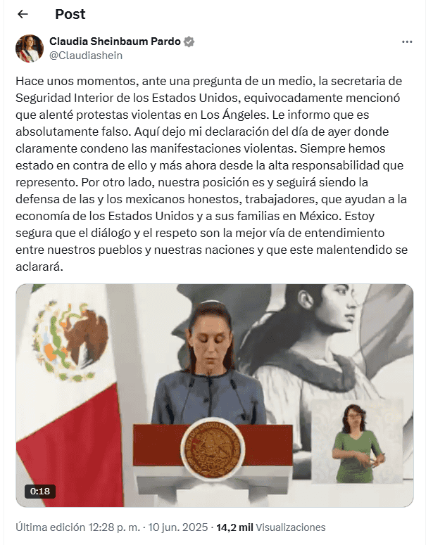 A través de un mensaje en su cuenta de X, Claudia Sheinbaum desmintió a la secretaria de Seguridad Nacional de Estados Unidos, Kristi Noem, quien el día de hoy afirmó que la Presidenta de México "alentó" las protestas contra redadas en Los Ángeles, California.Al respecto, la Mandataria afirmó que Noem está equivocada.“Hace unos momentos, ante una pregunta de un medio, la secretaria de Seguridad Interior de los Estados Unidos, equivocadamente mencionó que alenté protestas violentas en Los Ángeles. Le informo que es absolutamente falso. Aquí dejo mi declaración del día de ayer donde claramente condeno las manifestaciones violentas”.La Presidenta calificó la situación como un malentendido que eventualmente se aclarara, sin embargo, reiteró que el compromiso de su Gobierno es defender a los mexicanos en EU."Siempre hemos estado en contra de ello y más ahora desde la alta responsabilidad que represento. Por otro lado, nuestra posición es y seguirá siendo la defensa de las y los mexicanos honestos, trabajadores, que ayudan a la economía de los Estados Unidos y a sus familias en México. Estoy segura que el diálogo y el respeto son la mejor vía de entendimiento entre nuestros pueblos y nuestras naciones y que este malentendido se aclarará", escribió en una publicación. En un evento del presidente Donald Trump en la Oficina Oval, Noem dijo que Sheinbaum Pardo "salió y alentó más protestas en Los Ángeles, y la condeno por eso".Afirmó que Sheinbaum "no debería estar alentando las protestas violentas". Indicó que la gente "tiene derecho a la protesta pacífica", pero que "la violencia que estamos viendo no es aceptable, no va a ocurrir en Estados Unidos".En el video compartido en sus redes, Sheinbaum dice: "No estamos de acuerdo con las acciones violentas como forma de protesta, la quema de patrullas parece más un acto de provocación que de resistencia. Debe quedar claro, condenamos la violencia, venga de donde venga. Llamamos a la comunidad mexicana a actuar de manera pacífica y no caer en provocaciones".Con información de SUN* * * Mantente al día con las noticias, únete a nuestro canal de WhatsApp * * *MB