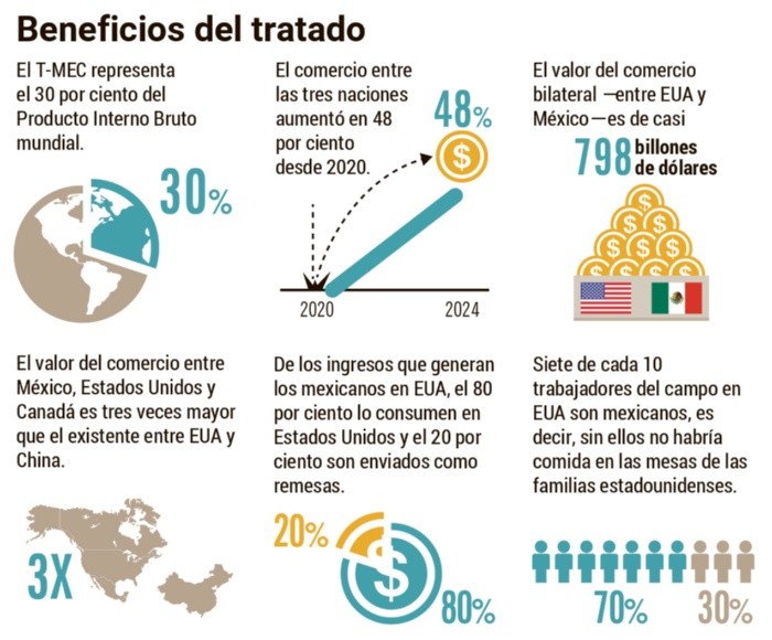 La presidenta Claudia Sheinbaum Pardo afirmó que el T-MEC no debe ser visto como un subsidio para México, sino como un Tratado de Libre Comercio que también beneficia a Estados Unidos y Canadá.Señaló que el T-MEC ofrece grandes ventajas para los tres países y recordó que el acuerdo comercial fue firmado por el presidente Donald Trump y el presidente Andrés Manuel López Obrador, calificándolo como "el tratado comercial más exitoso".La mandataria destacó que desde 2020, el tratado ha incrementado el comercio entre los tres países en un 48%."México es hoy el principal socio comercial de los Estados Unidos. El valor del comercio bilateral fue de casi 798 billones de dólares. El comercio entre los tres países, México, Estados Unidos y Canadá, es tres veces, escuchen esto, tres veces mayor que el comercio entre Estados Unidos y China", resaltó.Sheinbaum Pardo agregó "no debemos concebir que este tratado comercial es como un subsidio a México, todo lo contrario, es una economía de los tres países que es la economía más poderosa de todo el mundo, la de Norteamérica. Representamos el 30% del Producto Interno Bruto de todo el mundo".En ese sentido, la presidenta mexicana comentó que los migrantes mexicanos en Estados Unidos apoyan a sus familias y que este año se esperan 60 mil millones de dólares en remesas."Fíjense, de todo lo que ganan nuestros paisanos, solamente envían poco menos del 20%, el 80% lo consumen en Estados Unidos para beneficio de su economía. Siete de cada 10 trabajadores del campo en Estados Unidos son mexicanos, lo que significa que sin ellos y sin ellas no habría comida en las mesas de las familias estadounidenses."Eliminar el consumo de los trabajadores mexicanos sería equivalente en Estados Unidos a destruir el valor generado en la propia economía de Estados Unidos por la totalidad que generan en la agricultura", refirió la presidenta Claudia Sheinbaum. YC