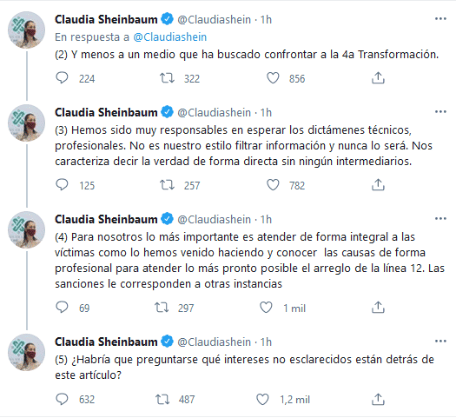 Luego que el diario The New York Times publicó una investigación sobre el Metro de la CDMX, que habla sobre que desde que inició la construcción de la Línea 12 fue una tragedia, la jefa de Gobierno de la Ciudad de México, Claudia Sheinbaum dijo que nunca en su administración han utilizado filtraciones periodísticas para informar o hacer su trabajo.El reportaje se encuentra basado en documentos gubernamentales que abarcan varios años, entrevistas con personas que trabajaron en la construcción y análisis de la evidencia del lugar del siniestro realizado por expertos, además de señalar a Marcelo Ebrard y Carlos Slim como presuntos responsables."Sobre el artículo que aparece en el NYT el día de hoy sobre la línea 12 y la afirmación que algunos han hecho de que la información provino del gobierno de la Ciudad, aclaro categóricamente que nunca hemos utilizado filtraciones periodísticas para informar o hacer nuestro trabajo. Y menos a un medio que ha buscado confrontar a la 4a Transformación", escribió en twitter.Aclaró que han sido muy responsables en esperar los dictámenes técnicos profesionales. "No es nuestro estilo filtrar información y nunca lo será. Nos caracteriza decir la verdad de forma directa sin ningún intermediario".Agregó que para la administración lo más importante es atender de forma integral a las víctimas como lo han venido haciendo y "conocer las causas de forma profesional para atender lo más pronto posible el arreglo de la línea 12. Las sanciones les corresponden a otras instancias"."¿Habría que preguntarse qué intereses no esclarecidos están detrás de este artículo?", comentó Claudia Sheinbaum tras la publicación del diario The New York Times.Este domingo, el diario estadounidense The New York Times publicó un reportaje sobre la tragedia de la Línea 12 del Metro, que señalan está basado en documentos gubernamentales, entrevistas con personas que trabajaron en la construcción del sistema de transporte y análisis de la evidencia encontrada en el lugar del siniestro.The New York Times señala que graves fallas en la construcción podrían ser la causa del colapso del tramo elevado de la estación Olivos.GC