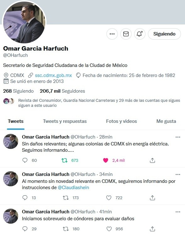 Luego del fuerte sismo registrado al sureste de Acapulco, Guerrero, de magnitud 7.1 y que se percibió además en la Ciudad de México, el secretario de Seguridad Ciudadana de la Ciudad de México (CDMX), Omar García Harfuch informó que hasta el momento no se cuentan daños relevantes en la capital del país.A través de su cuenta de Twitter, García Harfuch informó que algunas colonias de la CDMX permanecen sin energía eléctrica, pero descartan daños relevantes.El funcionario capitalino señaló que seguirán informando. Antes, había dicho que comenzaron un "sobrevuelo de cóndores para evaluar daños".El Servicio Sismológico Nacional (SSN) corrigió la magnitud del sismo de esta noche y afirmó que fue de 7.1 y se localizó a 11 kilómetros al suroeste de Acapulco, Guerrero a las 20:47:46 horas de este martes 7 de septiembre.La jefa de Gobierno de la Ciudad de México, Claudia Sheinbaum, informó esta noche que se reunió en el C5 con el equipo de Protección Civil y "no se ha encontrado daño alguno ni ningún reporte", luego de que la Secretaría de Seguridad Ciudadana realizara tres sobrevuelos.Sheinbaum también compartió que habló con el Presidente Andrés Manuel López Obrador (AMLO) y le compartió esta información.La jefa de Gobierno reconoció que hay personas sin luz y que ya estableció comunicación con la Comisión Federal de Electricidad (CFE) para restaurar el servicio. Pidió "tranquilidad, estamos al pendiente y vamos a seguir informando".Si te interesó esta noticia y quieres saber más, entonces descarga y descubre INFORMAPlus, la aplicación digital de EL INFORMADOR, en donde tenemos contenidos exclusivos, seleccionados por nuestros editores, para darles una experiencia más completa a los lectores.Descarga la aplicación y pruébala GRATIS por treinta días.Para iOS: https://apple.co/35jaVgb Para Android: https://bit.ly/3gwVSEVSi eres suscriptor de EL INFORMADOR tu acceso está incluido, solicítalo al 33 3678-7777 OA