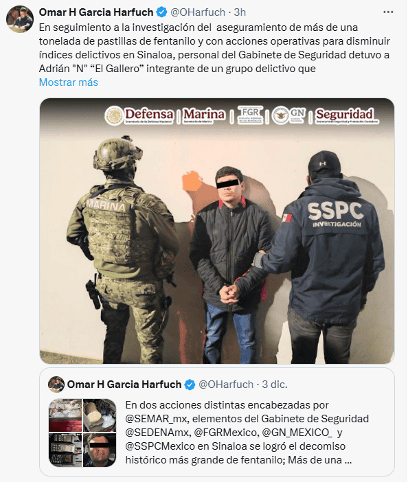 La Secretaría de Seguridad y Protección Ciudadana (SSPC) de México anunció este jueves 5 de diciembre la detención de Adrián "N", alias "El Gallero", implicado en el decomiso de más de una tonelada de fentanilo, la mayor de la historia del país, ocurrida el martes en Sinaloa.El titular de la SSPC, Omar García Harfuch, informó que "personal del Gabinete de Seguridad detuvo a Adrián "N" "El Gallero" integrante de un grupo delictivo que opera en Sinaloa y relacionado con la droga asegurada hace dos días"."Las investigaciones en el estado continúan", agregó el funcionario en un breve mensaje en X.En un comunicado, la SSPC detalló que la detención fue "resultado de trabajos de inteligencia e investigación para identificar y detener a generadores de violencia en el estado de Sinaloa".El operativo ocurrió en conjunto con la Secretaría de la Defensa Nacional (Defensa), la Guardia Nacional, la Secretaría de Marina (Semar) y la Fiscalía General de la República (FGR).La autoridad explicó que, durante un patrullaje de vigilancia en la carretera Los Mochis - Navojoa, agentes detectaron una camioneta que conducía de forma errática y realizó maniobras evasivas al notar su presencia.Ante esto, los agentes interceptaron el vehículo y al inspeccionarlo encontraron una bolsa de plástico con pastillas de fentanilo de color azul.Al detenido, de 30 años, "se le vincula con una célula delictiva dedicada a confeccionar y elaborar pastillas de fentanilo en Culiacán", además de estar relacionado con el aseguramiento de más de una tonelada de fentanilo ocurrido en días pasados en el estado", agregó la dependencia.La captura ocurre luego de que el martes la SSPC informara sobre un operativo realizado en Sinaloa, estado del noroeste del país, en el que confiscaron cerca de 300 kilos de fentanilo en un domicilio y otros 800 kilos de la misma droga en una camioneta.La Presidenta de México, Claudia Sheinbaum, ha destacado que esta es la incautación "más grande que se haya hecho" de pastillas de fentanilo, equivalentes a más de 20 millones de dosis, lo que podría haber generado cerca de 8 mil millones de pesos en el mercado negro.La acción se da en medio de la presión del presidente electo de Estados Unidos, Donald Trump, para que México controle el tráfico de fentanilo y la migración, bajo amenaza de imponer aranceles del 25% a productos mexicanos.Apenas el martes, Harfuch afirmó que la violencia en Sinaloa había logrado contenerse, pese a que las cifras oficiales muestran que en los primeros dos meses del Gobierno de Sheinbaum, el 7.3% de los homicidios dolosos en el país se concentraron en ese estado, el segundo más violento de México.*Mantente al día con las noticias, únete a nuestro canal de WhatsAppOF