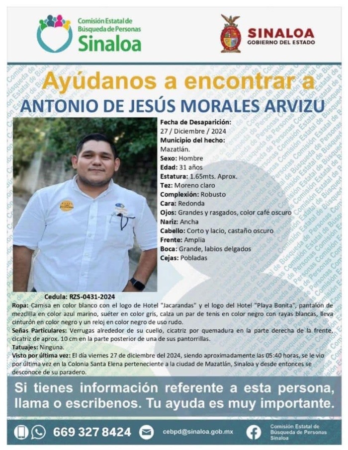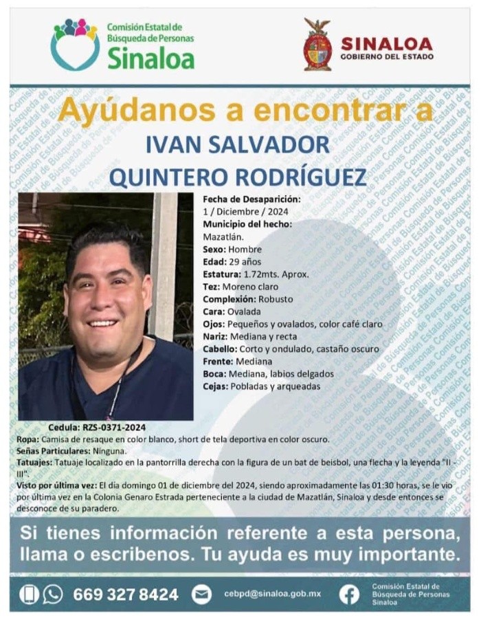 En Sinaloa, la ola de violencia también tiene el rostro de las desapariciones. En Mazatlán, desaparecen otros tres jóvenes.En la ciudad de Mazatlán, se sumaron tres nuevas fichas de búsqueda de jóvenes con reportes de desaparición, entre ellas están las de los hermanos, Antonio de Jesús y Alexis Morales Arvizu, de 31 y 26 años de edad, respectivamente, los cuales fueron vistos por última vez el pasado viernes.Las nuevas alertas de búsqueda se conocieron en el marco, de una manifestación realizada en el puerto, por familiares y amigos de la joven profesionista, Merarit Adriana Peña López, reportada como desaparecida desde la noche del pasado 15 de diciembre cuando salió a cenar en la zona del fraccionamiento Sábalo Country y no regresó.Según los datos emitidos por la Comisión Estatal de Búsqueda de Personas, Antonio de Jesús, tiene una estatura de un metro 65 centímetros, es de complexión robusta, cara redonda, viste una camisa blanca con logotipo del hotel "Jacaranda".Como señas particulares, este tiene una arruga alrededor del cuello, una cicatriz por quemadura y fue visto por última vez, la tarde del pasado viernes, en la colonia Santa Elena, de la ciudad de Mazatlán, junto con su hermano.Alexis, de 26 años de edad, cuenta con una estatura de un metro 69 centímetros, tez morena, complexión delgada, cara ovalada, como señas particulares, tiene un lunar en la nariz del lado izquierdo, un tatuaje en el cuello del lado derecho, con la figura de varias calaveras y otro tatuaje en el antebrazo derecho, con la leyenda "La vida es dura".La tercera persona reportada como desaparecida el pasado primero de diciembre, en la colonia Genaro Estrada, es el joven, Iván Salvador Quintero Rodríguez, de 29 años de edad, con una estatura de un metro 72 centímetros, tez moreno claro, complexión robusta y nariz mediana y recta.Como señas particulares, este tiene un tatuaje en la pantorrilla derecha con la figura de un bat de beisbol y una fecha.En la zona conocida como el parador turístico de las letras, en el puerto de Mazatlán, cerca de la avenida del Mar, se concentraron familiares y amigos de la joven Merarit Adriana para pedir que se acelere su búsqueda de otras personas que son víctimas de desapariciones forzadas.Según la ficha que emitió la Comisión Estatal de Búsqueda de Personas, Merarit Adriana, de 29 años de edad, con una estatura de un metro 68 centímetros, complexión delgada, cara ovalada y ojos cafés claros, fue ubicada por última vez a las nueve de la noche, del pasado 15 de diciembre en el fraccionamiento Sábalos Country.La joven que trabaja en uno de los hoteles de Mazatlán, la cual culminó la carrera universitaria de administración de empresas, esa noche notificó a sus padres que saldría a cenar con una amiga, por lo que partió en su vehículo, el cual no ha sido localizado.Su familia se muestra preocupada, ya que un día antes, otra joven de nombre Teresita de Jesús Gutiérrez, de 23 años de edad, desaparición en forma extraña en ese mismo fraccionamiento y días antes un joven.* * * Mantente al día con las noticias, únete a nuestro canal de WhatsApp * * *OA