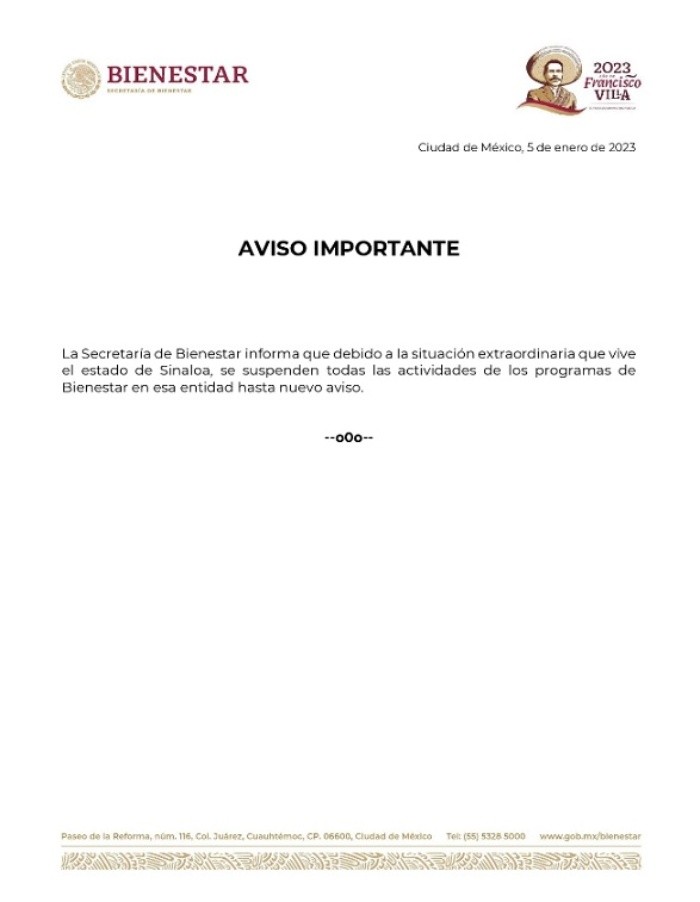 La detención de Ovidio Guzmán López, "El Ratón", de 32 años, ayer por la mañana en Culiacán, Sinaloa, desató intensos tiroteos entre criminales y fuerzas de seguridad, que generaron, además, bloqueos y agresiones en distintas partes de la ciudad; incluso, se suspendieron actividades escolares, laborales y administrativas, entre ellas, las de los programas de Bienestar del Gobierno federal.Fue a través de un breve comunicado, que la Secretaría del Bienestar informó que debido a la situación extraordinaria que se vive en el estado de Sinaloa, todas las actividades de sus programas, entre ellas las del cambio de la Tarjeta del Bienestar y la pensión para adultos mayores, quedaban suspendidas en Sinaloa hasta nuevo aviso.Hasta este viernes, no se ha comunicado del regreso de los trabajos y se mantenía la suspensión.Ayer por la tarde, el Gobierno federal confirmó la detención en Culiacán de Ovidio Guzmán López, "El Ratón", uno de los hijos del narcotraficante Joaquín "Chapo" Guzmán, que cumple una condena en Estados unidos.Luego de su detención, Ovidio Guzmán fue trasladado en un avión de la Secretaría de la Defensa Nacional (Sedena) a la Ciudad de México, lo que desató una jornada violenta en Sinaloa, con enfrentamientos armados en los que se reportaron vehículos y tiendas incendiados, narcobloqueos, balaceras y despojo de automóviles. OA