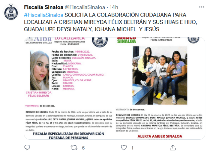 Autoridades del estado de Sinaloa emitieron alertas de búsqueda por cinco miembros de una familia, una mamá y sus cuatro hijos, que fueron reportadas como desaparecidas desde el pasado 16 de marzo. La última vez que se les vio fue cuando salieron de su casa en la colonia Jardines del Pedregal; cuatro de ellas son del sexo femenino de nueve, 12, 14, y 33 años de edad.La Fiscalía General del Estado divulgó los avisos de búsqueda, una de ellas corresponde a la Alerta Alba, de Cristian Mireyda Félix Beltrán, de 33 años de edad, con una estatura de un metro, 55 centímetros, complexión medina, la cual es identificada como la madre de cuatro menores de edad.Por considerar que ella, al igual que sus cuatro hijos, se encuentran en riesgo, se solicita a la población contribuyan con su búsqueda y aporten datos para su ubicación a las autoridades judiciales.De acuerdo a la Alerta Amber emitida por los menores de edad, se da a conocer sus imágenes con los nombres de Brenda Guadalupe, Deysi Natali, Johana Michell y Jesús, todos ellos de apellidos Félix Félix, de 14, 12, 9 y 4 años de edad, respetivamente.GC
