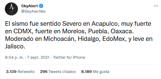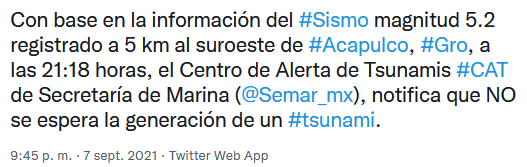 Tras el fuerte temblor de 7.1 grados que se registró la noche de este lunes en Acapulco, Guerrero, Protección Civil de México informó que no hay alerta de tsunami en el puerto.En su mensaje compartido en redes sociales, detallaron que según el Centro de Alerta de Tsunamis de la Secretaría de Marina, no hay ningún peligro.Hasta el momento autoridades no han informado sobre daños graves, sin embargo, continúan con los recorridos para evaluar las posibles afectaciones.Según SkyAlert, el sismo fue sentido de manera “leve” en Jalisco, mientras que en Acapulco se percibió de manera “severa”, “muy fuerte” en Ciudad de México, “fuerte” en Morelos, Puebla, Oaxaca y “moderado” en Hidalgo, Michoacán, Estado de México.Si te interesó esta noticia y quieres saber más, entonces descarga y descubre INFORMAPlus, la aplicación digital de EL INFORMADOR, en donde tenemos contenidos exclusivos, seleccionados por nuestros editores, para darles una experiencia más completa a los lectores.Descarga la aplicación y pruébala GRATIS por treinta días.Para iOS: https://apple.co/35jaVgb Para Android: https://bit.ly/3gwVSEVSi eres suscriptor de EL INFORMADOR tu acceso está incluido, solicítalo al 33 3678-7777