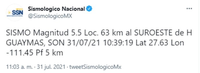 La mañana de este sábado se registró un sismo magnitud 5.5 en Guaymas, Sonora, informó el Servicio Sismológico Nacional.A través de su cuenta de Twitter, el organismo señaló que el movimiento telúrico se dio al suroeste de Guaymas a las 10:39 horas.A su vez, se registró otro sismo en Baja California Sur, al este de Santa Rosalía.Usuarios en redes sociales comentaron que en la parte de Sonora se percibió fuerte, pero breve.SISMO Magnitud 5.5 Loc 63 km al SUROESTE de H GUAYMAS, SON 31/07/21 10:39:19 Lat 27.63 Lon -111.45 Pf 5 km.Sigue leyendo… Si te interesó esta noticia y quieres saber más, entonces descarga y descubre INFORMAPlus, la aplicación digital de EL INFORMADOR, en donde tenemos contenidos exclusivos, seleccionados por nuestros editores, para darles una experiencia más completa a los lectores. Descarga la aplicación y pruébala GRATIS por treinta días. Si eres suscriptor de EL INFORMADOR tu acceso está incluido, solicítalo al 33 3678-7777OF