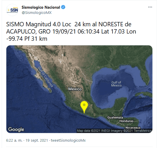 Un sismo de magnitud 4 se registró la mañana de este domingo cerca de Acapulco, Guerrero, sin dejar daños ni personas lesionadas, informó el Servicio Sismológico Nacional (SSN).De acuerdo con la información, el movimiento telúrico se detectó a las 06:10 hora local, a 24 kilómetros al noreste de Acapulco.Debido a que no fue de gran intensidad no se han reportado personas lesionadas o afectaciones en la zona y tampoco se activaron las alarmas sísmicas de la Ciudad de México.El pasado 7 de septiembre un terremoto de magnitud 7.1 con epicentro cerca de Acapulco provocó escasos daños a pesar de su intensidad.A casi dos semanas de dicho movimiento telúrico, hasta este domingo a las 08:00 horas han ocurrido mil 093 réplicas del mismo.Este día se cumplen 36 años del sismo del 19 de septiembre de 1985 (de magnitud 8.1) y cuatro del ocurrido en la misma fecha, pero de 2017 (de magnitud 7.1).Días antes, el 7 de septiembre de 2017, un sismo de magnitud 8.2 con epicentro en el sureño estado de Chiapas había causado 98 víctimas mortales.Éstos últimos sismos dejaron miles de daños materiales en Ciudad de México y entidades como Guerrero, Oaxaca, Chiapas, Morelos y Puebla.Por ello, este día a las 11:30 hora local se llevó a cabo un macrosimulacro en todo el país por lo que las alertas sísmicas de 12 mil 825 altavoces en la Ciudad de México se activaron con el fin de realizar un ejercicio de simulación de una emergencia y practicar los procesos de evacuación de inmuebles.Según investigadores de la Universidad Nacional Autónoma de México (UNAM), en los últimos 70 años en el mes de septiembre se concentran en México el mayor número de terremotos de magnitud siete o mayor.Sigue leyendo…Si te interesó esta noticia y quieres saber más, entonces descarga y descubre INFORMAPlus, la aplicación digital de EL INFORMADOR, en donde tenemos contenidos exclusivos, seleccionados por nuestros editores, para darles una experiencia más completa a los lectores.Descarga la aplicación y pruébala GRATIS por treinta días.Si eres suscriptor de EL INFORMADOR tu acceso está incluido, solicítalo al 33 3678-7777OF