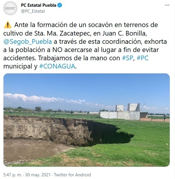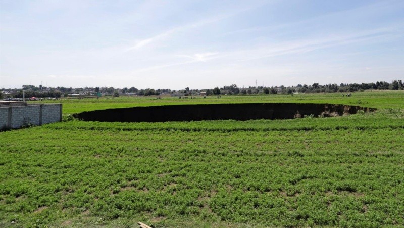 Una falla geológica provocó un enorme socavón cuyo diámetro ha ido creciendo en el estado de Puebla, según las primeras investigaciones de autoridades."Es un asunto de enorme riesgo. Le digo a los poblanos y a la gente de la región de que vamos a estar pendientes de que no haya tragedias humanas. Es una falla geológica que hay que atender con mucho cuidado, con técnica y con todas las prevenciones y lo estamos haciendo", explicó hoy el gobernador de Puebla, Miguel Barbosa, en conferencia de prensa.Por su parte, la secretaria de Medio Ambiente estatal, Beatriz Manrique, explicó que el hoyo comenzó a crearse el sábado pasado, siendo de no más de 5 metros de diámetro, y en 24 horas creció hasta los 30 metros.Según detalló Manrique, hace algunas horas alcanzaba ya los 60 metros de diámetro y usuarios de Twitter compartieron videos en los que se ve que continúa creciendo al desprenderse parte de los bordes que caen al fondo, donde hay gran cantidad de agua. Según medios locales, la profundidad del socavón sería de unos 20 metros.El desprendimiento se dio en un terreno de cultivo en la localidad de Santa María Zacatepec, del municipio Juan C. Bonilla, a poco más de 20 kilómetros de Puebla capital, en una zona donde solamente hay algunas casas pequeñas y humildes de las personas que trabajan los sembradíos.La secretaria dijo que todavía es pronto para conocer los motivos de la creación del socavón.Manrique agregó que en la zona existía un "jagüey" -pozo o zanja llena de agua- que fue tapado para ubicar tierras de cultivo."Puede que hubiese un reblandecimiento de la tierra de cultivo y extracción de mantos acuíferos. Y cuando fue mayor la presión del agua que hay en la capa superficial que la del suelo, se generó una variación y el peso sobre la corteza terrestre, que terminó cediendo", detalló.Protección Civil de Puebla se desplazó a la zona junto con otras autoridades para asegurarse de que nadie se acerque y no se corran riesgos.Por su parte, Protección Civil México compartió en la misma una imagen de las labores que se están llevando a cabo en el lugar y detallaron que se está trabajando para "mitigar el riesgo hacia la población".Añadieron que se realizó una evacuación preventiva de una vivienda cercana al socavón y que se mantiene un cerco de seguridad de 500 metros alrededor del hoyo. IM