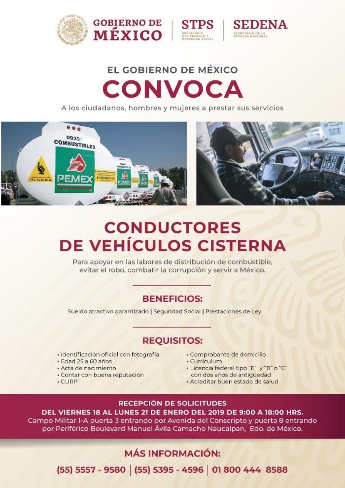 Como parte de las medidas de seguridad para el combate del robo de gasolina y aunado al plan DN-III, el Presidente Andrés Manuel López Obrador, informó durante rueda de prensa convocatoria para la contratación de dos mil conductores de vehículos tipo cisterna que ayuden al transporte de gasolina a los diferentes estados del país.La convocatoria para hombres y mujeres de 25 a 60 años de edad de cualquier estado, estará abierta desde este viernes 18 al próximo lunes 21 de enero, informó el mandatario.Algunos de los requisitos que deberán presentar los interesados es Licencia federal tipo “E” y “B” o “C”, tener al menos dos años de antigüedad con el documento, currículum, CURP, acreditar un buen estado de salud, identificación con fotografía oficial, acta de nacimiento, contar con buena reputación y comprobante de domicilio.Los requisitos deberán ser entregados de 9:00 a 18:00 horas en el Campo Militar 1-A puerta 3 entrando por Avenida del Conscripto y puerta 8 entrando por Periférico Boulevard Manuel Ávila Camacho, Naucalpan en el Estado de México.Las personas que sean aceptadas recibirán un sueldo de 14 mil pesos quincenales, seguridad social y prestaciones de Ley además de recibir protección por parte del Ejército, Policía Federal y la Secretaría de Marina durante la transportación de 200 mil barriles diarios.Según López Obrador, la medida impulsará hasta en un 25% la capacidad del sistema de distribución por pipas durante el proceso del combate al robo de combustible.Para más información: (55) 5557-9580; (55)5395-4596; 01 800 444 8588.NM