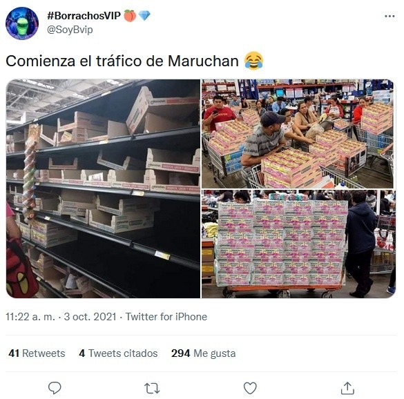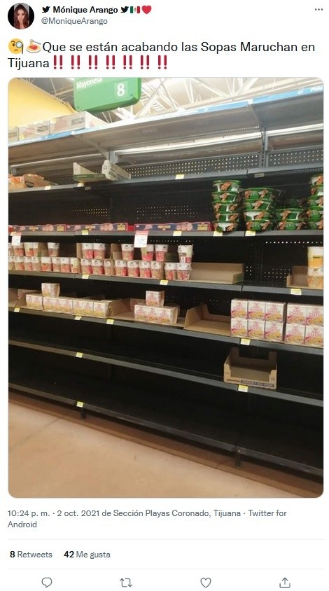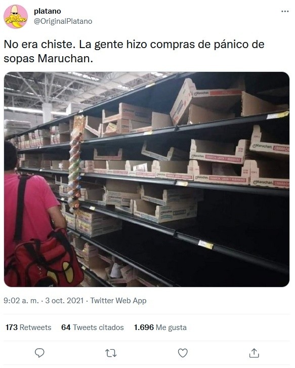 Durante el pasado fin de semana, las redes sociales dieron a conocer imágenes de una supuesta serie de compras de pánico en tiendas de conveniencia de sopas instantáneas luego de que la Procuraduría Federal del Consumidor (Profeco) anunciara el posible retiro del mercado de algunas marcas por su bajo aporte nutrimental.Los usuarios de Twitter, por ejemplo, compartieron imágenes de estantes vacíos en comercios donde las sopas instantáneas presuntamente fueron agotadas ante la posibilidad de desaparecer de la oferta en México. La cuenta @OriginalPlatano compartió una fotografía en Twitter donde se observan cajas de una marca de sopas instantáneas completamente vacías en una tienda, mientras asegura: "No era chiste. La gente hizo compras de pánico de sopas Maruchan", aunque esta misma imagen es replicada en muchas ocasiones por otros usuarios.Carlos Armando Ramírez Blanco @defaux_armando aseguró en la misma red social que la gente hacía compras de pánico en Pachuca, Hidalgo, mientras lo toma con humor.La cuenta @SoyBvip señaló que comenzó el tráfico de sopas instantáneas, al tiempo que @pugrito respondió que la imagen que compartía era falsa y que el hombre cargando un carrito lleno de producto corresponde a una situación muy parecida, pero que en 2020 se refería a un consumidor que cargaba papel higiénico, en referencia a la polémica al inicio de la pandemia sobre la compra de ese producto de higiene personal.En una imagen más real, sin un fotomontaje, @MoniqueArango difundió otro anaquel semivacío de producto. Dijo que la escena corresponde a Tijuana.El pasado 1 de octubre, la Profeco dio a conocer que prácticamente todas las marcas de sopas instantáneas que se venden en el país tienen un alto contenido de sodio, alto nivel calórico y muy bajo aporte nutrimental, por lo que sugirió la posibilidad de retirarlas del mercado. También en redes sociales llovieron críticas a la Profeco por su advertencia de retirar a las sopas instantáneas de las tiendas, pero no hacer nada con relación a la venta de alcohol o cigarro que, para muchos, son más nocivos que los productos de comida chatarra. Con memes y mensajes, usuarios señalaron su descontento con la medida y preguntaron con ironía a la autoridad qué comerán las personas que viven solas o los estudiantes foráneos que llegan a la Ciudad de México.Si te interesó esta noticia y quieres saber más, entonces descarga y descubre INFORMAPlus, la aplicación digital de EL INFORMADOR, en donde tenemos contenidos exclusivos, seleccionados por nuestros editores, para darles una experiencia más completa a los lectores.Descarga la aplicación y pruébala GRATIS por treinta días.Para iOS: https://apple.co/35jaVgb Para Android: https://bit.ly/3gwVSEVSi eres suscriptor de EL INFORMADOR tu acceso está incluido, solicítalo al 33 3678-7777OA