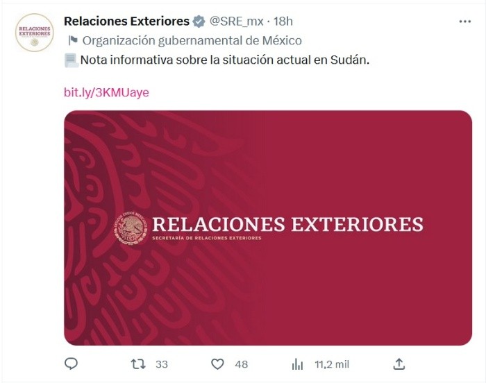 El Gobierno de México expresó a través de un comunicado su "profunda preocupación" por los violentos acontecimientos que han dejado más de 180 civiles muertos en la República de Sudán y se unió al llamado de la ONU para pedir un cese al fuego, al tiempo que confirmó que nueve mexicanos se encuentran en medio del conflicto."México se suma al llamado del secretario general de la Organización de las Naciones Unidas a las partes en conflicto -en Sudán- para cesar inmediatamente las hostilidades, restaurar la calma e iniciar un diálogo para resolver la crisis actual", apuntó en un comunicado la Secretaría de Relaciones Exteriores (SRE).El gobierno dijo que México "coincide plenamente con Naciones Unidas en la necesidad de un cese al fuego y una pausa humanitaria que permitan a los civiles atrapados en zonas de conflicto acceder a servicios y suministros básicos, asistencia médica o salir del país de manera segura".Además, la SRE dijo que, por medio de su Embajada en Egipto, concurrente ante Sudán, "ha estado en contacto permanente con las nueve personas mexicanas que se tiene conocimiento se encuentran en Sudán".Señaló que ante la escalada del conflicto y debido al riesgo que se corre en las calles de Jartum y otras ciudades de Sudán, "se ha recomendado a las personas mexicanas permanecer en sus domicilios hasta que la situación permita su salida segura del país".También indicó que permanece atenta a la evolución de la situación "y se mantiene en contacto con varios actores internacionales a fin de evaluar la mejor forma de que las personas mexicanas puedan salir del país bajo medidas de seguridad".Más de 180 civiles han muerto y más de mil 800 han resultado heridos durante los tres días de combates en Sudán, según datos del enviado especial de la ONU en el país africano, Volker Perthes.JM