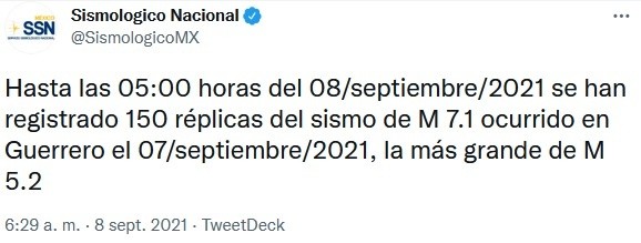 El Servicio Sismológico Nacional (SSN) informó que hasta las 05:00 horas suman 150 réplicas del sismo de ayer martes, 7 de septiembre de 2021, de magnitud 7.1.La réplica de mayor intensidad fue de 5.2.El terremoto ocurrido la noche de este martes tuvo epicentro en Acapulco, Guerrero, en donde falleció una persona, según el gobernador, Héctor Astudillo.El sismo se sintió en diversos estados y en la CDMX, en donde hubo pánico, cortes de luz y afectaciones en el Cablebús, pero las autoridades capitalinas sólo reportaron daños menores.Hace 4 años, el 7 de septiembre de 2017 un sismo de 8.2 con epicentro en Oaxaca se registró poco antes de la medianoche. Ese terremoto es el de más fuerte registrado desde hace casi 100 años.Si te interesó esta noticia y quieres saber más, entonces descarga y descubre INFORMAPlus, la aplicación digital de EL INFORMADOR, en donde tenemos contenidos exclusivos, seleccionados por nuestros editores, para darles una experiencia más completa a los lectores.Descarga la aplicación y pruébala GRATIS por treinta días.Para iOS: https://apple.co/35jaVgb Para Android: https://bit.ly/3gwVSEVSi eres suscriptor de EL INFORMADOR tu acceso está incluido, solicítalo al 33 3678-7777OA