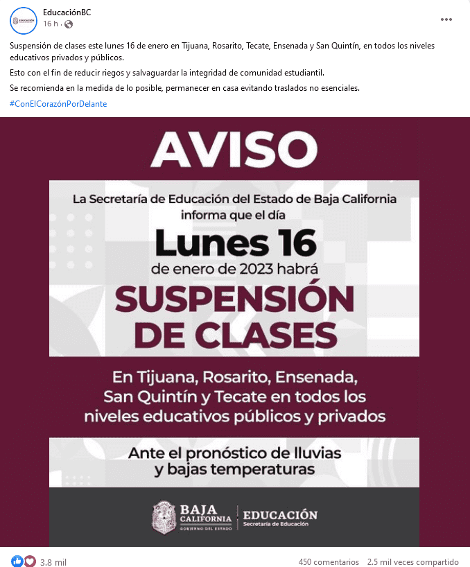Ayer, la Secretaría de Educación de Baja California informó que se suspendían clases hoy lunes en Tijuana y otros municipios del estado debido a las condiciones climáticas.El Servicio Meteorológico Nacional pronostica que el frente frío 25 y una corriente en chorro favorecerá lluvias y frío en la entidad, así como también en los estados de Sonora y Chihuahua, donde se prevén nevadas en zonas montañosas.Los municipios de Baja California donde no habrá clases hoy lunes 16 de enero son: Tijuana, Playas de Rosarito, Tecate, Ensenada y San Quintín."Esto con el fin de reducir riegos y salvaguardar la integridad de comunidad estudiantil", dice el comunicado difundido en redes oficiales de la Secretaría de Educación local. Además, "recomienda en la medida de lo posible, permanecer en casa evitando traslados no esenciales".La medida aplica para todos los niveles educativos públicos y privados.A los ciudadanos se les sugiere estar al pendiente de la página oficial de la Secretaría de Educación de Baja California, para saber si mañana martes los estudiantes volverán o no a las clases presenciales.OF