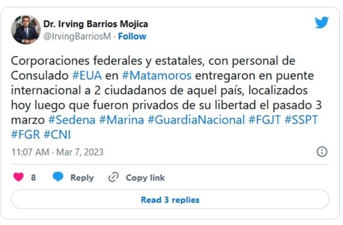 Corporaciones federales y estatales, con personal del Consulado Estados Unidos en Matamoros, entregaron en el puente internacional 2 a dos ciudadanos de aquel país localizados hoy luego que fueron privados de su libertad el pasado 3 marzo.La mañana de este martes, se confirmó que los cuatro estadounidenses secuestrados y agredidos por un comando armado durante la balacera que se vivió el 3 marzo en Matamoros fueron encontrados.El fiscal general de justicia de Tamaulipas, Irving Barrios Mojica, confirmó el hallazgo de los cuatro estadounidenses que fueron privados de su libertad el viernes pasado en Matamoros; dos de ellos ya habían fallecido.JM