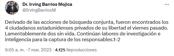 El gobernador de Tamaulipas, Américo Villarreal, confirmó en una llamada en la mañanera del Presidente Andrés Manuel López Obrador, que ya fueron localizados los 4 ciudadanos estadounidenses que según el FBI fueron secuestrados en Matamoros; dos de ellos fallecidos, uno herido y otro con vida."Ya fue plenamente confirmado por la fiscalía, de los cuatro hay dos de ellos fallecidos, un persona herida y la otra con vida", dijo el gobernador vía telefónica.Puesto en altavoz, el gobernador de Tamaulipas detalló que actualmente autoridades y familiares acuden al lugar y también se encuentra en camino personal sanitario "para dar el apoyo médico que se pueda requerir".La secretaria de Seguridad Pública y Protección Ciudadana, Rosa Icela Rodríguez, notificó durante la mañanera que ya hay un detenido en relación con el caso.El fiscal de Tamaulipas, Irving Barrios, confirmó a través de Twitter la información proporcionada por Villarreal. "Continúan labores de investigación e inteligencia para la captura de los responsables".El Presidente López Obrador expresó sus condolencias a la familia y allegados de los estadounidenses."Lamentamos mucho que esto suceda en nuestro país y enviamos a los familiares de las víctimas, a los amigos, al pueblo de Estados Unidos, al gobierno de Estados Unidos nuestras condolencias y vamos a seguir haciendo nuestro trabajo", dijo el Mandatario.López Obrador aseguró que las autoridades seguirán trabajando para garantizar la seguridad en el país, especialmente en el norte."Vamos a seguir haciendo nuestro trabajo. (...) Se va a buscar a los responsables, se les va a castigar, como se hizo cuando asesinaron a mujeres y niños en Bavispe de la familia LeBaron, Miller y Langford. Se detuvo a todos los involucrados", dijo el mandatario, quien aseguró que en México no hay impunidad.Los cuatro estadounidenses fueron reportados por el FBI como secuestrados el pasado 3 de marzo después de que hombres armados abrieron fuego contra el vehículo en el que cruzaron la frontera entre México y Estados Unidos.OF