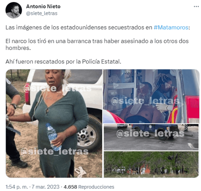 Luego de que la mañana de este martes el gobernador de Tamaulipas, Américo Villarreal, confirmara que los cuatro estadounidenses secuestrados el pasado viernes 3 de marzo fueron encontrados, dos de ellos muertos, la noticia comenzó a viralizarse en redes sociales.Es así como en Twitter se filtraron las imágenes de dos de los secuestrados, un hombre y una mujer, luego de que fueran encontrados.El periodista Antonio Nieto compartió las imágenes que muestran a dos de los estadounidenses mientras reciben atención médica. Las fotografías fueron acompañadas del mensaje:"Las imágenes de los estadounidenses secuestrados en #Matamoros: El narco los tiró en una barranca tras haber asesinado a los otros dos hombres. Ahí fueron rescatados por la Policía Estatal".Barbara Burgess, de 54 años y madre de Latavia, dijo a la cadena ABC que su hija viajó a Matamoros acompañada de su primo Shaeed para someterse a un "procedimiento médico cosmético". Los otros dos secuestrados, dijo Burgess, son amigos de su hija.Burgess aseguró a ABC que ella le pidió a su hija que no viajara a México. "Mamá, estaré bien", le respondió Latavia, antes de partir.Los cuatro estadounidenses, que viajaban en un auto con matrícula de Carolina del Norte, fueron atacados poco después de cruzar a México y tras ello fueron subidos a la fuerza en una camioneta tipo pick-up por hombres armados, informó el FBI de San Antonio.Los investigadores creen que los estadounidenses fueron atacados por error por un cártel mexicano que probablemente los confundió con traficantes de drogas haitianos, dijo a CNN un funcionario estadounidense familiarizado con la investigación.La cadena aseguró además haber obtenido fotos que muestran que el coche que conducían los estadounidenses se estrelló con otro vehículo, antes de que los viajeros fueran tomados a punta de pistola.Con información de EFEOA