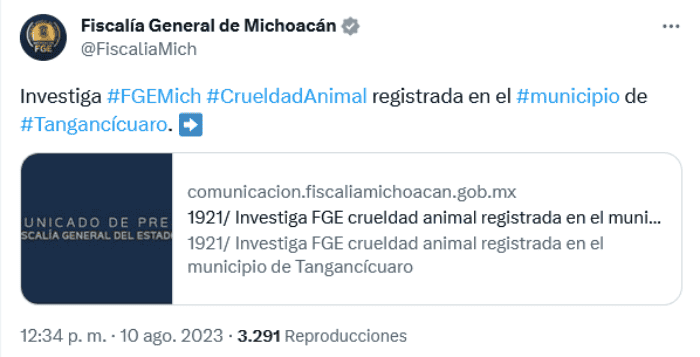 En redes sociales se volvió tendencia el municipio de Tangancícuaro luego de que usuarios hicieran réplica de la denuncia de los vecinos del alcalde David Melgoza Montañez, quien, aseguran, mató a dos perros a balazos mientras estaba acompañado de dos de sus escoltas.Señalan que el violento hecho ocurrió después de las 07:30 de la noche del pasado 9 de agosto, en calles de la colonia Santa Anita del municipio localizado en el estado de Michoacán.De acuerdo con información de El Universal, Roberto Armando, vecino del alcalde David Melgoza Montañez, se dio cuenta de que sus dos perros, "Buba" y "Canela", habían salido de su casa mientras él sacaba una motocicleta de su cochera, y que cuando fue a buscarlos, vio al presidente municipal sacar un arma y dispararles."Sólo le dije que por qué los mataba; que ya los dejara en paz, y no dijo nada, sólo se fue con sus dos guardaespaldas y fue todo", dijo consternado.También asegura que mientras ocurrió la agresión contra las mascotas, había niños jugando en la vía pública.En redes sociales también circula un video captado por cámaras de seguridad ubicadas en la zona donde ocurrió el hecho, y en estos se aprecia el momento en que los perros "Buba" y "Canela" corren por la calle mientras el alcalde y sus escoltar los siguen.En un boletín, la Fiscalía de Michoacán informó el pasado 10 de agosto que inició una carpeta de investigación con relación a hechos registrados la noche anterior en el municipio de Tangancícuaro, en los que murieron dos ejemplares caninos. Señalan que, en efecto, personal pericial encontró a los canes sin vida, a consecuencia de disparos de arma de fuego, por lo que de inmediato se trasladaron al sitio para llevar a cabo las actuaciones correspondientes.En el sitio, indican, se llevaron a cabo actuaciones a cabo diversas actuaciones en materia pericial y sus diferentes disciplinas, a efecto de obtener indicios que permitan el esclarecimiento de los hechos.OF