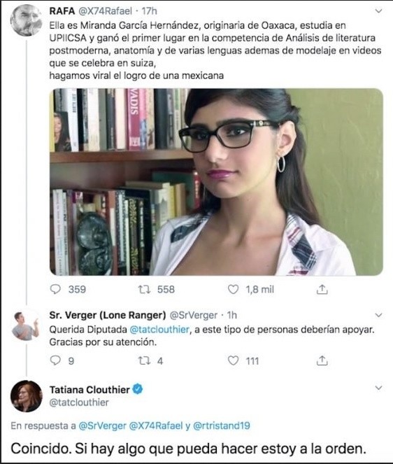 La diputada Tatiana Clouthier fue tendencia en redes sociales luego de que confundiera a la ex actriz porno Mia Khalifa con una estudiante oaxaqueña.A través de redes sociales, un usuario pidió ayuda para a la joven “Miranda García Hernández”, quien se supone habría ganado una competencia de análisis de literatura posmoderna; fue así que otra persona mencionó a la diputada y escribió: "a este tipo de personas deberían apoyar".Tatiana Clouthier cayó en la broma y ofreció su apoyo: “si hay algo que pueda hacer estoy a la orden”.De inmediato, el comentario se hizo famoso en Twitter, y varias personas le hicieron ver a Clouthier su error; más tarde, la legisladora compartió una publicación en donde reconoce su error con buen sentido del humor.“Me detuve a pedirle a la Virgen q me perdone x caer y sobre todo x promover porno”, escribió.JM