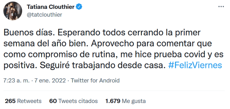 La secretaria de Economía, Tatiana Clouthier informó la mañana de este viernes a través de redes sociales que dio positivo a una prueba de COVID-19. En su cuenta de Twitter, Clouthier detalló que se hizo una prueba rutinaria, la cual dio positivo, por lo cual se aislará y trabajará desde casa. “Buenos días. Esperando todos cerrando la primer semana del año bien. Aprovecho para comentar que como compromiso de rutina, me hice prueba covid y es positiva. Seguiré trabajando desde casa. #FelizViernes”, escribió la funcionaria. Ante la pregunta de un usuario que se quejaba sobre la falta de atención para otorgar pruebas en los Centros de Salud de Iztapalapa, Clouthier aclaró que se hizo la prueba en el laboratorio Salud Digna. Apenas ayer jueves 6 de enero, Clouthier compartió una foto en redes sociales donde detallaba que estuvo repartiendo rosca de reyes con el equipo de limpieza, seguridad y servicio de la Secretaría de Economía. Finalmente, Clouthier no detalló si presentaba síntomas tras dar positivo a COVID.GC