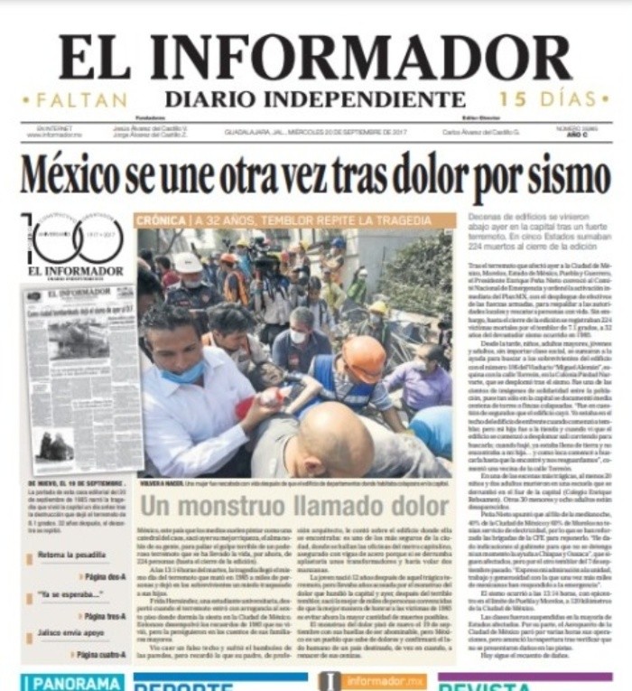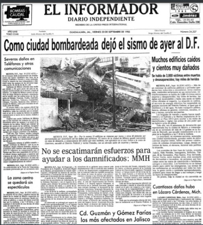 Este 19 de septiembre es el día que marcó al país en dos diferentes años debido a los temblores que dejaron dolor entre los mexicanos en 1985 y recientemente en 1917.Del primero de los sismos se cumplen este lunes 37 años y un lustro del segundo. Hoy 19 de septiembre de este año se realizará un macrosimulacro que dará inicio en punto de las 12:19 del mediodía. La convocatoria a realizarlo destaca principalmente en la Ciudad de México, pero el llamado es para todo el país. “Más de un centenar de edificios públicos y privados quedaron hoy reducidos a escombros, otros cientos más resentidos seriamente en sus estructuras. Extraoficialmente de habla de más de tres mil víctimas (...) La situación es caótica, no hubo transporte público, bancos, oficinas, comercios, escuelas, cines y teatros cerraron sus puertas”, fue como EL INFORMADOR consignó al día siguiente (20 de septiembre de 1985) el sismo en primera plana.En 1985, de magnitud 8.1 grados richter, se registró un sismo en las primeras horas de ese día. Ese día el terremoto sacudió a México a las 07:19 horas, cuando las personas se preparaban para ir a sus trabajos o a la escuela.El epicentro se localizó en el océano Pacífico, cerca de la desembocadura del río Balsas, en las costas del estado de Michoacán, y el hipocentro, a 15 kilómetros de profundidad bajo la corteza terrestre.El terremoto tuvo mayor afectación en el centro, sur y occidente de la nación, en particular la Ciudad de México.“Las avenidas de San Juan de Letrán, Avenida Juárez, Niño perdido, Insurgentes, Reforma, Tlalpan, 20 de Noviembre, Pino Suárez, Fray Servando, Doctor Vertiz, entre muchas otras, eran escenario de derrumbes e incendios; de personas buscando entre los restos de construcción a familiares, amigos o conocidos. Los bomberos no se daban abasto”, añade la publicación impresa de este medio el 20 de septiembre de 1985.La réplica fue un día después, la noche del 20 de septiembre, la cual tuvo gran repercusión, ya que terminó de colapsar edificios y domicilios que estaban frágiles. En aquel entonces la cultura de Protección Civil era básica, con nulos protocolos de acción, por lo que las horas posteriores fueron un caos. Sin embargo, la propia sociedad civil comenzó a organizarse en las labores de rescate y asistencia.Ha sido el más significativo y dañino en la historia contemporánea del país. En cuanto a las personas fallecidas, sólo existen estimaciones de que tres mil 192 fue la cifra oficial, mientras que 20 mil fue el dato resultante de los cálculos de algunas organizaciones.Este 19 de septiembre se cumplen 37 años de ese acontecimiento y se realizará el macrosimulacro con la finalidad de poner en práctica las labores que deben realizarse en ese tipo de desastres naturales. Este sismo se registró a las 13:14 horas, y tuvo una magnitud de 7.1 Richter. Fue localizado en el límite estatal entre los estados Puebla y Morelos, a 12 kilómetros al sureste de Axochiapan, Morelos y a 120 kilómetros de la Ciudad de México.Con saldo de 369 muertos, de los cuales 228 fueron de la Ciudad de México, 74 de Morelos, 45 de Puebla, 15 del Estado de México, 6 de Guerrero y uno de Oaxaca.“Niños, adultos mayores, jóvenes y adultos, sin importar la clase social, se sumaron a la ayuda para buscar a los sobrevivientes”, publicó EL INFORMADOR el 20 de septiembre de 2017, con referencia a una de las imágenes de solidaridad que brindó la población igual como lo hizo en el otro sismo 32 años atrás-En total hubo 11 mil 495 damnificados que solicitaron ayuda al gobierno de la Ciudad de México, para reparación, rehabilitación, y recuperación de sus propiedades. Una de las escenas más trágicas ese día fue en el colegio Enrique Rebsamen de la Ciudad de México que colapsó y dejó 26 fallecidos, entre ellos 19 niños.El edificio estaba construido con irregularidades, por lo que la tragedia fue mayor y a la dueña, Mónica García Villegas, se le sentenció a 31 años de cárcel por homicidio culposo y a una reparación del daño de 400 mil pesos por cada víctima. La perrita Frida, binomio canino de rescate de la Secretaría de Marina (Semar) que participó en los días previos en búsqueda y rescate, destacó por su labor con 12 salvaciones de personas con vida, además de que dio alivio a 43 familias que recibieron los restos de sus seres queridos.