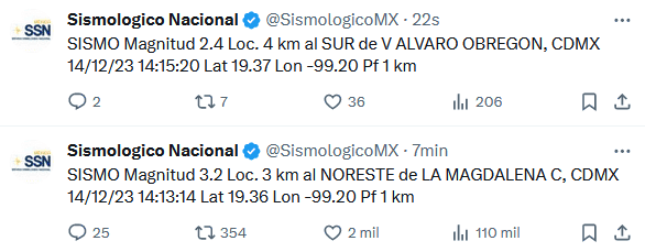 Dos microsismos más se sintieron este jueves 14 de diciembre en la Ciudad de México (CDMX), sin que hasta el momento se reporten daños de consideración.Tal como sucedió el pasado 12 de diciembre, algunas alcaldías de la CDMX percibieron el temblor.El Servicio Sismológico Nacional informó, a través de su cuenta de Twitter, que en el primer microsismo el epicentro fue en la alcaldía Magdalena Contreras y la magnitud de 3.2.El segundo, en la alcaldía Álvaro Obregón y su magnitud fue de 2.4. Entre uno y otro, sólo hubo dos minutos de diferencia.En la ciudad ya comenzaron a aplicarse los protocolos correspondientes. Muchos habitantes reportaron que no percibieron el movimiento telúrico, como tampoco escucharon las alertas sísmicas.Por su parte, SkyAlert informó que se trata del sismo más grande de la secuencia iniciada el 10 de mayo de este año.* * * Mantente al día con las noticias, únete a nuestro canal de WhatsApp * * *OA