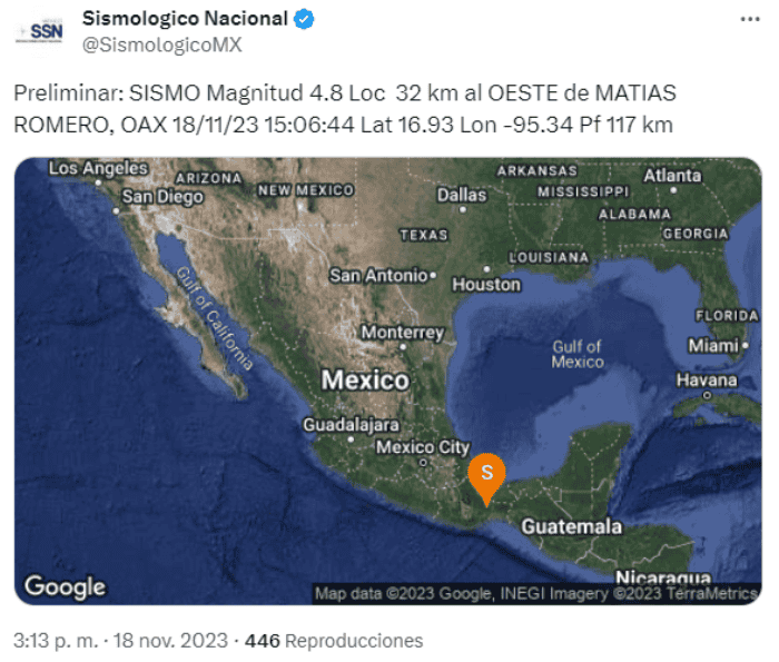 Durante la tarde de este sábado 18 de noviembre se registró un temblor de magnitud 4.8 en el estado de Oaxaca, se reportó con una intensidad moderada fuerte.El Sismológico Nacional brindó la información a través de sus redes sociales, la hora se registró a las 15:06 de la tarde y su epicentro se ubicó a 32 kilómetros al oeste de Matías Romero. A través de redes sociales algunos usuarios reportan que el evento fue imperceptible en la Ciudad de México y que se pudo sentir fuerte en Oaxaca, Chiapas y Veracruz.SV