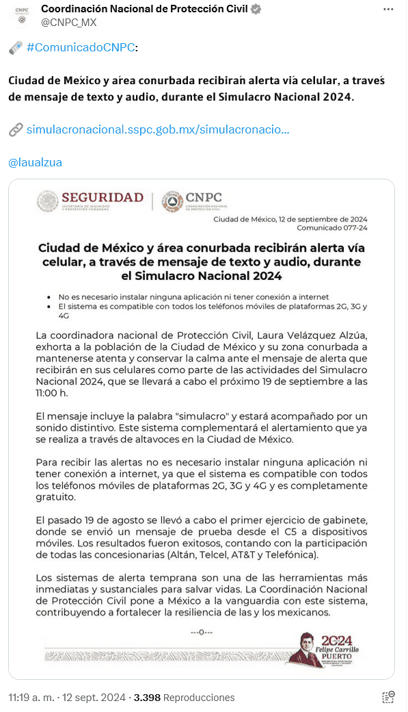 Este 19 de septiembre, a las 11:00 horas, se llevará a cabo, como ocurre cada año, un macro simulacro nacional, con el propósito de fomentar la cultura de la Protección Civil en la población, y contribuir con el fortalecimiento de las capacidades de reacción de las unidades internas y sus brigadas ante la eventualidad de una emergencia o desastre, entre estos, causados por un sismo o temblor.Como parte de las acciones relacionadas con este simulacro, este jueves, la Coordinación Nacional de Protección Civil, a través de sus redes sociales, informó que habitantes en la Ciudad de México y el área conurbada recibirán en su celular, a través de un mensaje de texto y audio, un mensaje de alerta.La coordinadora nacional de Protección Civil, Laura Velázquez Alzúa, invita a la población a estar atenta ante este mensaje y a conservar la calma cuando lo reciban, y recuerda que se deberá al ejercicio de prevención.PC señala que el mensaje incluirá la palabra "simulacro" y estará acompañado de un sonido distintivo. Este complementará el sistema de alerta que se tiene en la Ciudad de México mediante los altavoces.Recuerdan que no es necesario instalar alguna aplicación en el celular para recibir la alerta ni se debe contar con Internet, ya que el sistema de alertamiento es compatible con las plataformas móviles de 2G, 3G, 4G, y es gratis.Como es costumbre y como ocurre en cada uno de los puntos donde se realizará este macro simulacro, se tendrá una hipótesis específica de sismo. Debes estar alerta en canales oficiales sobre cualquier cambio que se tenga respecto a las actividades para ese día.*Mantente al día con las noticias, únete a nuestro canal de WhatsAppOF
