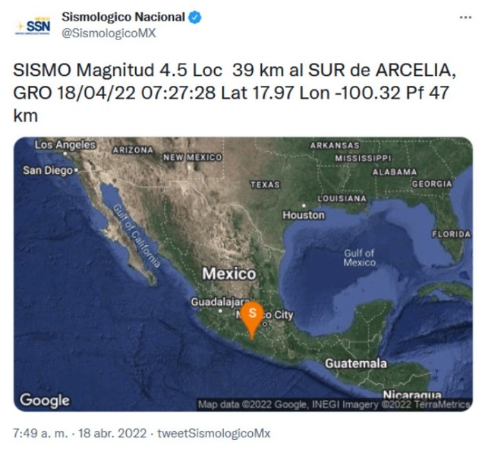 Este lunes 18 de abril se registró un sismo de magnitud 4.5 con epicentro en Arcelia, Guerrero.Alrededor de las 7:30 de la mañana, el centro de Guerrero fue sacudido por este fenómeno natural de intensidad leve, según informó el Servicio Sismológico Nacional (SSN).Además, en la Ciudad de México, pese a que no se activó la alerta sísmica, usuarios en redes sociales reportaron el movimiento en varias alcaldías.PC