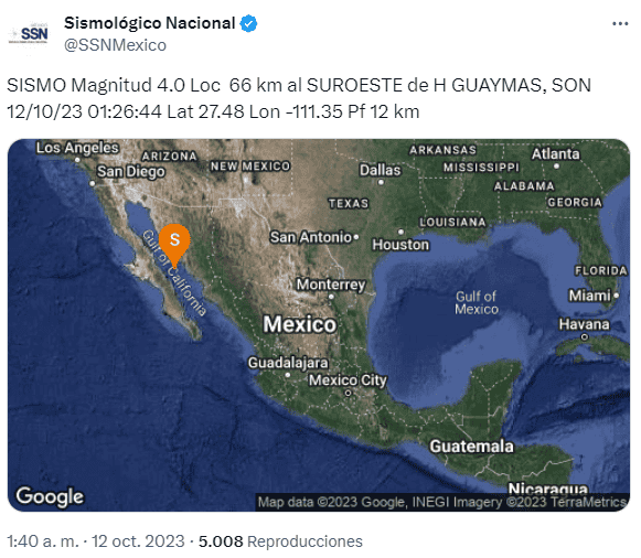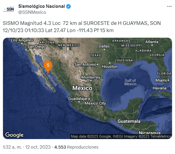 La Coordinación Estatal de Protección Civil (CEPC) en Sonora informa que no hubo daños ni afectaciones por los dos sismos que se presentaron durante la madrugada de este jueves, cerca de Guaymas, en el Mar de Cortés.El Servicio Sismológico Nacional informó que el primer sismo magnitud 4.3 se localizó a 72 kilómetros al suroeste de Guaymas, a las 01:10:33 horas, con una profundidad de 15 kilómetros.El segundo temblor fue de magnitud 4.0, se localizó a 66 kilómetros al suroeste de Guaymas, a las 01:26:44, con una profundidad de 12 kilómetros. OF