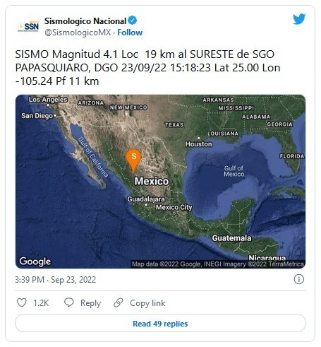 Luego de que se registrara este viernes otro sismo de magnitud 5.5 con epicentro en Tecóman, Colima, el Servicio Sinológico Nacional (SSN) reporto un nuevo sismo de 4.1 en Santiago Papasquiaro en Durango. Esta es una réplica más del sismo de 7.7 grados registrado el lunes 19 de septiembre.A través de su cuenta de Twitter, el Servicio Sismológico Nacional informó que el sismo de magnitud 4.1 se reportó este 23 de septiembre a las 15:18 horas en el sureste de Santiago Papasquiro. Hasta el momento no se han registrado daños.Según la publicación de su cuenta oficial hasta las 16:00 horas de este viernes se han registrado mil 681 réplicas del sismo del pasado lunes de 7.7 ocurrido en Michoacán. La réplica más fuerte se registró la madrugada del jueves, la cual tuvo su epicentro en Coalcomán, Michoacán y fue de 6.9 grados.JM