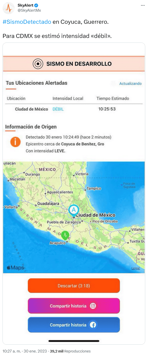 La mañana de este lunes 30 de enero se registró un temblor con epicentro en el estado de Guerrero. El sismo fue notificado por diferentes aplicaciones.En sus redes sociales, el Servicio Sismológico Nacional (SSN) indicó que el temblor de hoy registró una magnitud de 4.6, con epicentro a 24 kilómetros al suroeste de Coyuca de Benítez, a una profundidad de 5 kilómetros.Según SASSLA, la plataforma digital de Alertamiento de Riesgos en México, el temblor no ameritó la alerta sísmica en la Ciudad de México.Hasta el momento no se tienen reportes de daños.OF
