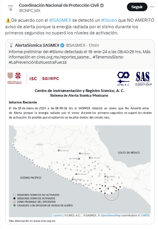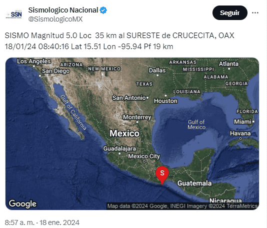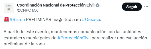 Este jueves se registró un temblor alrededor de las 08:40 horas de la mañana en Oaxaca, el cual no activó la alerta sísmica en la Ciudad de México, aunque esa versión circuló en diversos medios nacionales.El Servicio Sismológico Nacional reporta una magnitud preliminar de 5, con epicentro al sureste de Crucecita. Más adelante confirmó el dato en sus redes sociales el SSN.También en sus plataformas, la Coordinadora Nacional de Protección Civil señaló que a partir del sismo, mantienen comunicación con las unidades estatales y municipales de para realizar una evaluación preliminar de la zona.De acuerdo con el Sistema de Alerta Sísmica (Sasmex), el temblor de hoy no ameritó aviso de alerta "porque la energía radiada por el sismo durante los primeros segundos no superó los niveles de activación".*Mantente al día con las noticias, únete a nuestro canal de WhatsApp OF