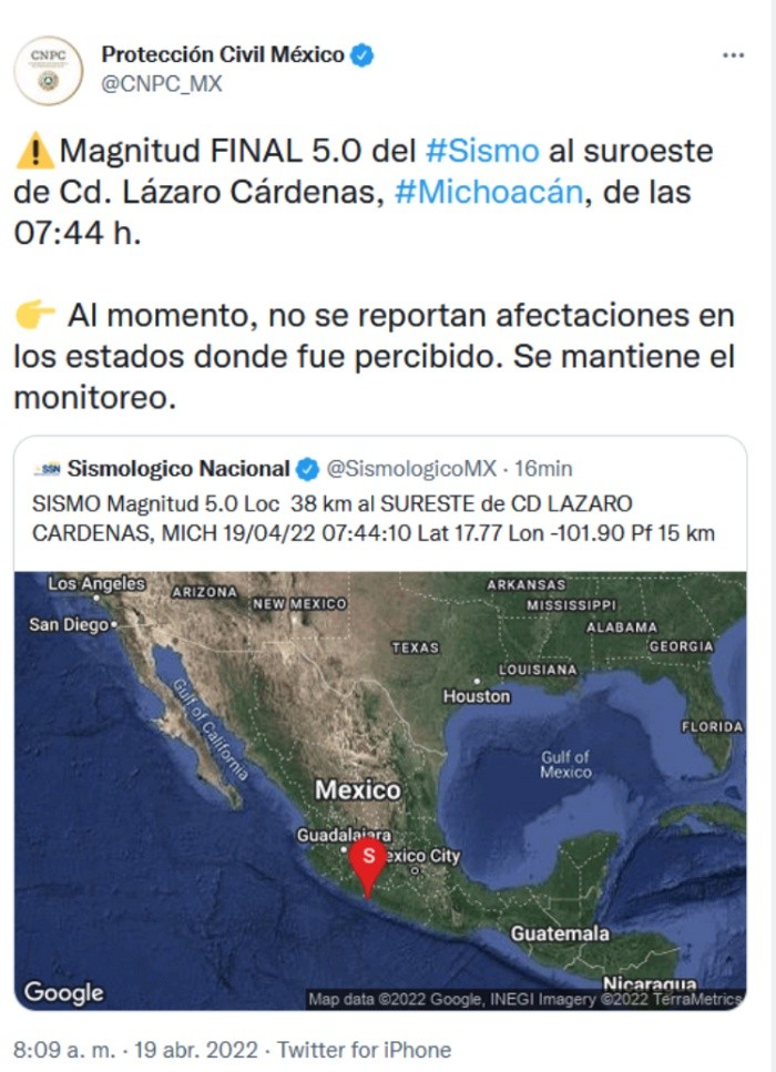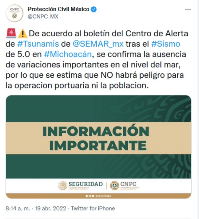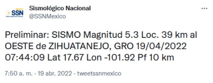 Los servicios de alerta sísmica de diferentes aplicaciones registraron un temblor hoy 19 de abril en el estado de Guerrero, y de inmediato, el fenómeno se volvió tendencia en redes sociales.Posteriormente, el Servicio Sismológico Nacional (SSN) informó que el sismo, de magnitud preliminar de 5.3 se registró a 39 kilómetros al oeste de Zihuatanejo, Guerrero, a las 07:44 horas, con una profundidad de 10 kilómetros.Posteriormente, el SSN ajustó el temblor a magnitud 5.0, con epicentro a 38 kilómetros al sureste de Lázaro Cárdenas, Michoacán, a las 07:44 horas, y con a una profundidad de 15 kilómetros.El evento no ameritó alerta sísmica en otros estados, incluida la Ciudad de México.En su cuenta de Twitter, la Coordinación Nacional de Protección Civil del Gobierno de México (CNPC) informó que ya se mantiene comunicación con las unidades estatales y municipales y los integrantes del Comité Nacional de Emergencias (CNE) para realizar una evaluación preliminar tras el temblor de hoy.De acuerdo con el boletín del Centro de Alerta de Tsunamis de la Secretaría de Marina (Semar), tras el sismo de este 19 de abril de magnitud 5.0 en Michoacán, "se confirma la ausencia de variaciones importantes en el nivel del mar, por lo que se estima que NO habrá peligro para la operación portuaria ni la población".OF