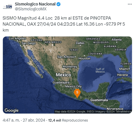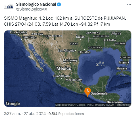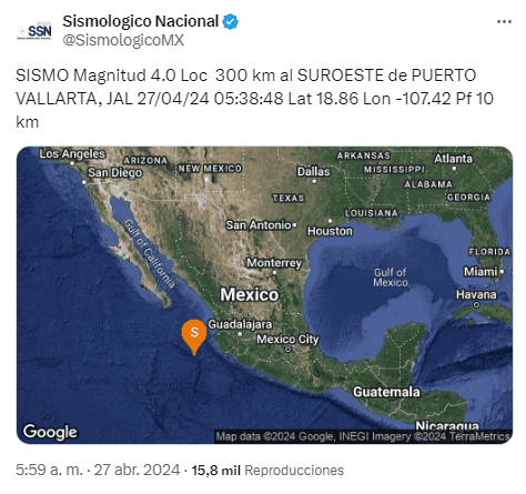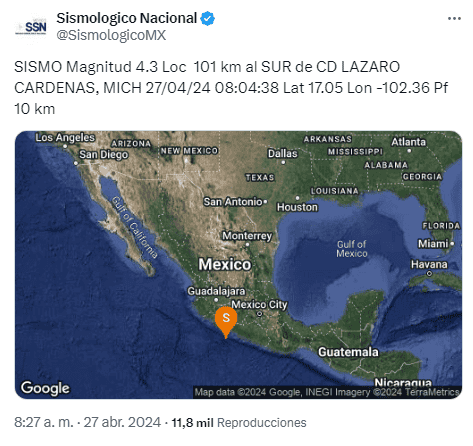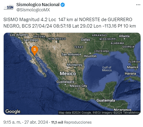 La mañana de hoy sábado 27 de abril se registraron temblores de entre 4 y 4.4 de magnitud en varios estados, estos son Sinaloa, Baja California, Jalisco, Michoacán, Chiapas y Oaxaca, todos en el Pacífico mexicano, de acuerdo con el Servicio Sismológico Nacional (SSN).A través de su cuenta de X, el SSN informó que a las 08:04 se registró un sismo de magnitud 4.3, a 101 kilómetros al sur de Lázaro Cárdenas, Michoacán.Luego, a las 08:57 horas, ocurrió otro sismo pero de magnitud 4.2, a 147 kilómetros al noreste de Guerrero Negro, Baja California.Un movimiento telúrico se registró más temprano, a las 05:38 horas en Jalisco, este de magnitud 4.0, a 300 kilómetros al suroeste de Puerto Vallarta.También durante la madrugada, a las 04:23 horas se tuvo registro de un temblor de 4.4 en Oaxaca, 28 kilómetros al este de Pinotepa Nacional.Mientras que a las 03:17 horas de este sábado hubo un sismo, pero este en Chiapas, a 162 kilómetros al suroeste de Pijijiapan.En Sinaloa también hubo un sismo durante la madrugada de este sábado. El movimiento se registró a las 02:02 horas, a 102 kilómetros al suroeste de Los Mochis.Hasta el momento, no se reportan daños en alguno de los lugares donde se reportaron los fenómenos naturales. *Mantente al día con las noticias, únete a nuestro canal de WhatsAppOF