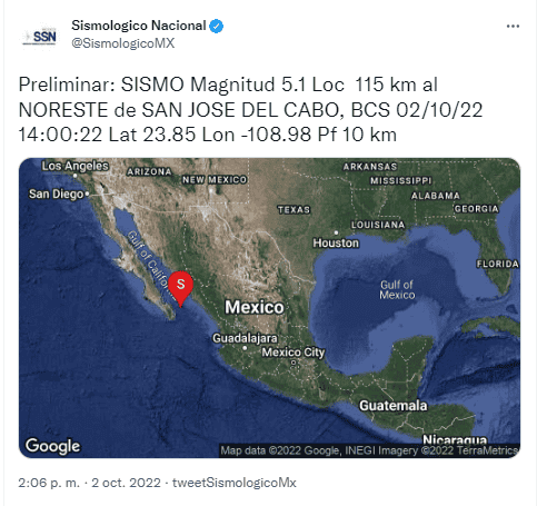 De acuerdo con el Servicio Sismológico Nacional (SSN), este domingo 2 de octubre se registró un temblor de magnitud preliminar de 5.1 a 115 kilómetros al oeste de San José del Cabo, Baja California Sur.Después, el SSN ajustó el sismo a magnitud 5.5, con epicentro a 125 kilómetros de San José del Cabo, y ocurrido a las 14:00 horas.En sus redes sociales, Protección Civil indicó que tras el sismo, se mantiene comunicación con las unidades estatales y municipales de para realizar una evaluación preliminar de la zona.Al momento no hay reporte de daños o afectaciones.OF