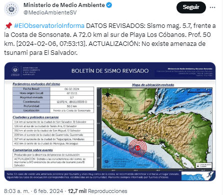 La mañana de este martes 6 de febrero se registró un temblor de magnitud preliminar 5.7 a 319 km sureste del municipio de Ciudad Hidalgo, en Chiapas.En un mensaje publicado en su cuenta de X (antes Twitter), el Servicio Sismológico Nacional (SSN) señaló que el sismo ocurrió a las 07:53 horas, a una profundidad de 10 kilómetros.En sus cuentas oficiales, el presidente de El Salvador, Nayib Bukele, indicó que el temblor tuvo origen en la costa de ese país. Pidió mantener la calma mientras se monitorea para descartar riesgos.Por su parte, el Ministerio de Medio Ambiente de El Salvador indicó que el temblor de 5.7 tuvo epicentro a 72 kilómetros al sur de la playa Los Cóbanos. Descartan alerta de tsunami por el momento.*Mantente al día con las noticias, únete a nuestro canal de WhatsApp OF