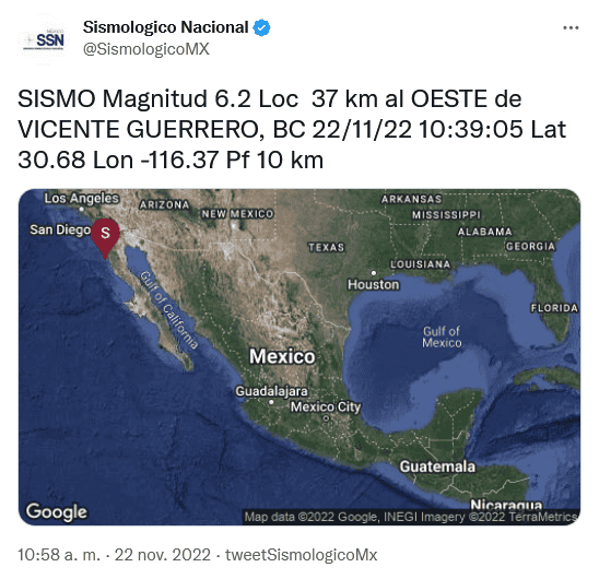 El Servicio Sismológico Nacional reportó un temblor hoy de magnitud preliminar de 6, a 33 kilómetros de Vicente Guerrero, Baja California."Preliminar: SISMO Magnitud 6 Loc. 33 km al OESTE de VICENTE GUERRERO, BC 22/11/2022 10:39:10 Lat 30.72 Lon -116.33 Pf 10 km", publicó el SSN en su cuenta de Twitter.Después, se ajustó la magnitud a 6.2.Por su parte, la Coordinadora Nacional de Protección Civil informó que tras el temblor de hoy, se mantiene "comunicación con las unidades estatales y municipales de Protección Civil y los integrantes del Comité Nacional de Emergencias, para realizar una evaluación preliminar de la zona".Después, el mismo organismo indicó que de acuerdo con el boletín del Centro de Alerta de tsunamis de la Secretaría de Marina (Semar), tras el sismo, se confirma la ausencia de variaciones en el nivel del mar, por lo que se estima que "NO habrá peligro para la operación portuaria ni la población".OF